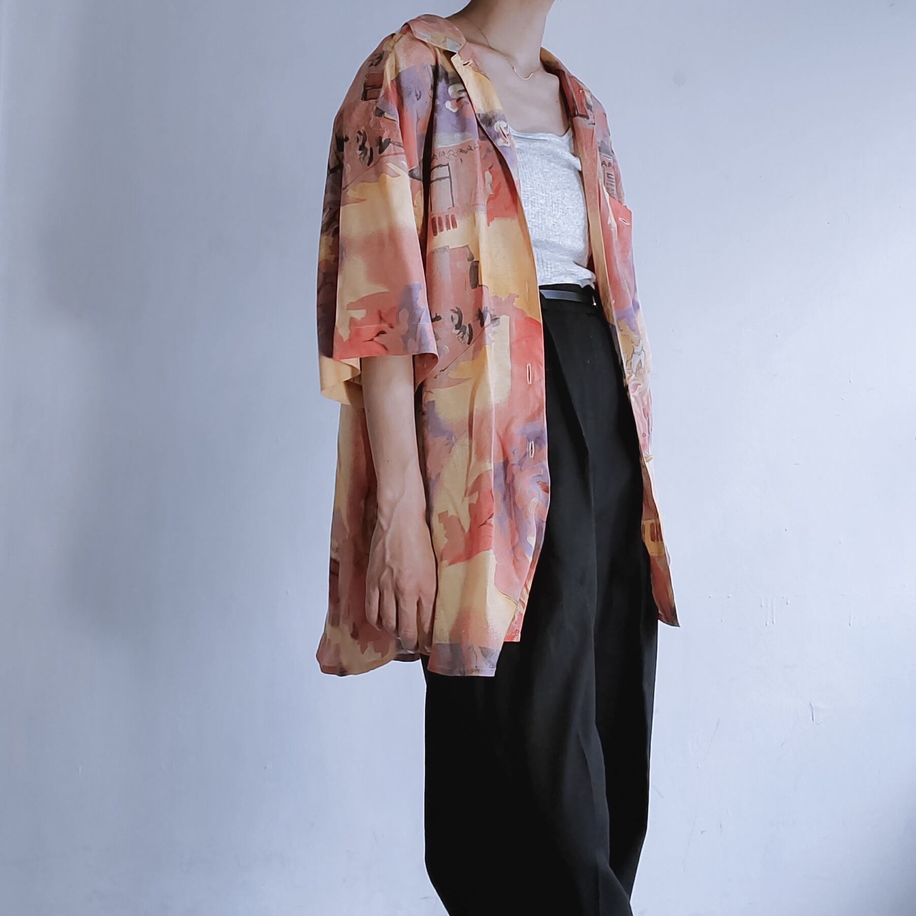 アートな80sの柄シャツ。ファーストボタンまで付いていて、首詰めた着方も開襟でも着られます。