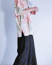淡い赤×グレーのプリントが目を引く90sポリシャツ。オーバーサイズをボトムインしたりアウトでルーズに着るのも◎