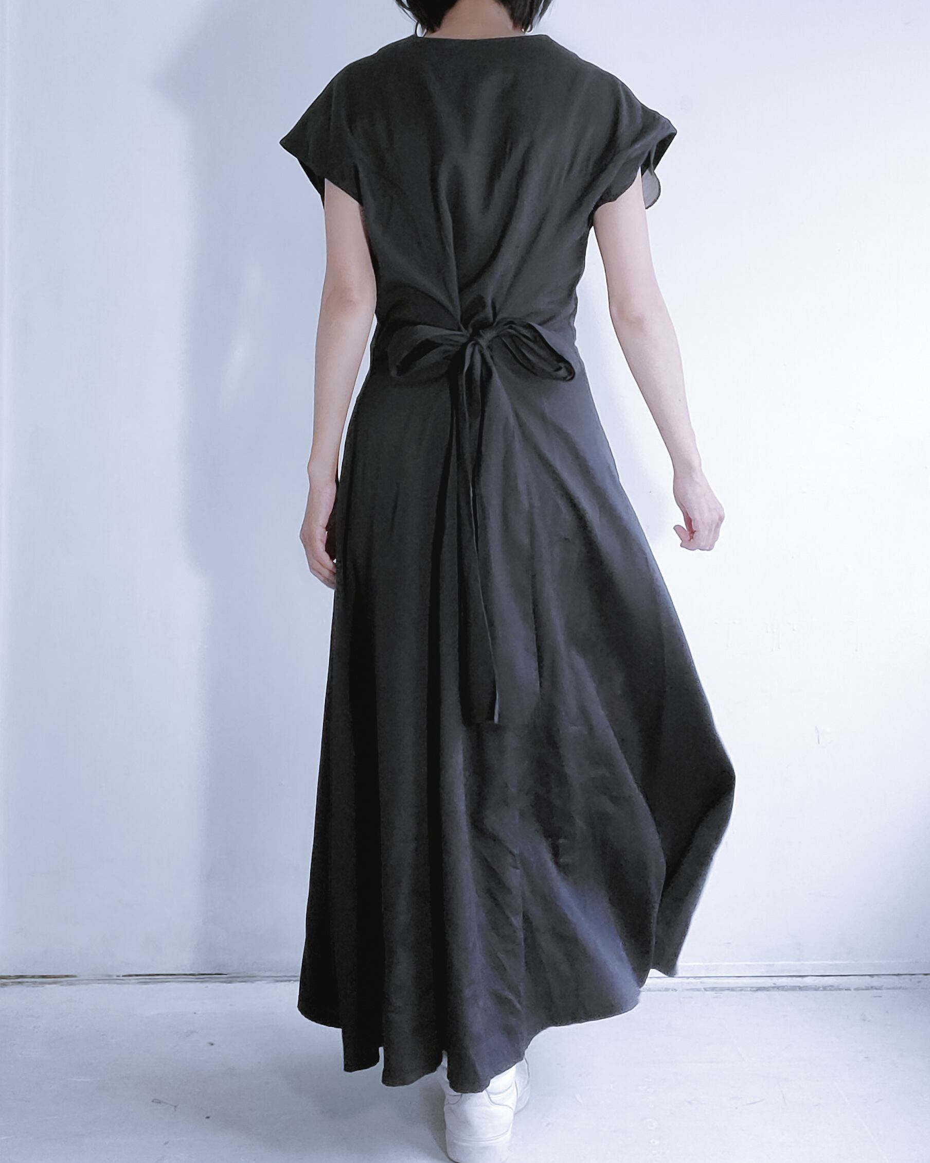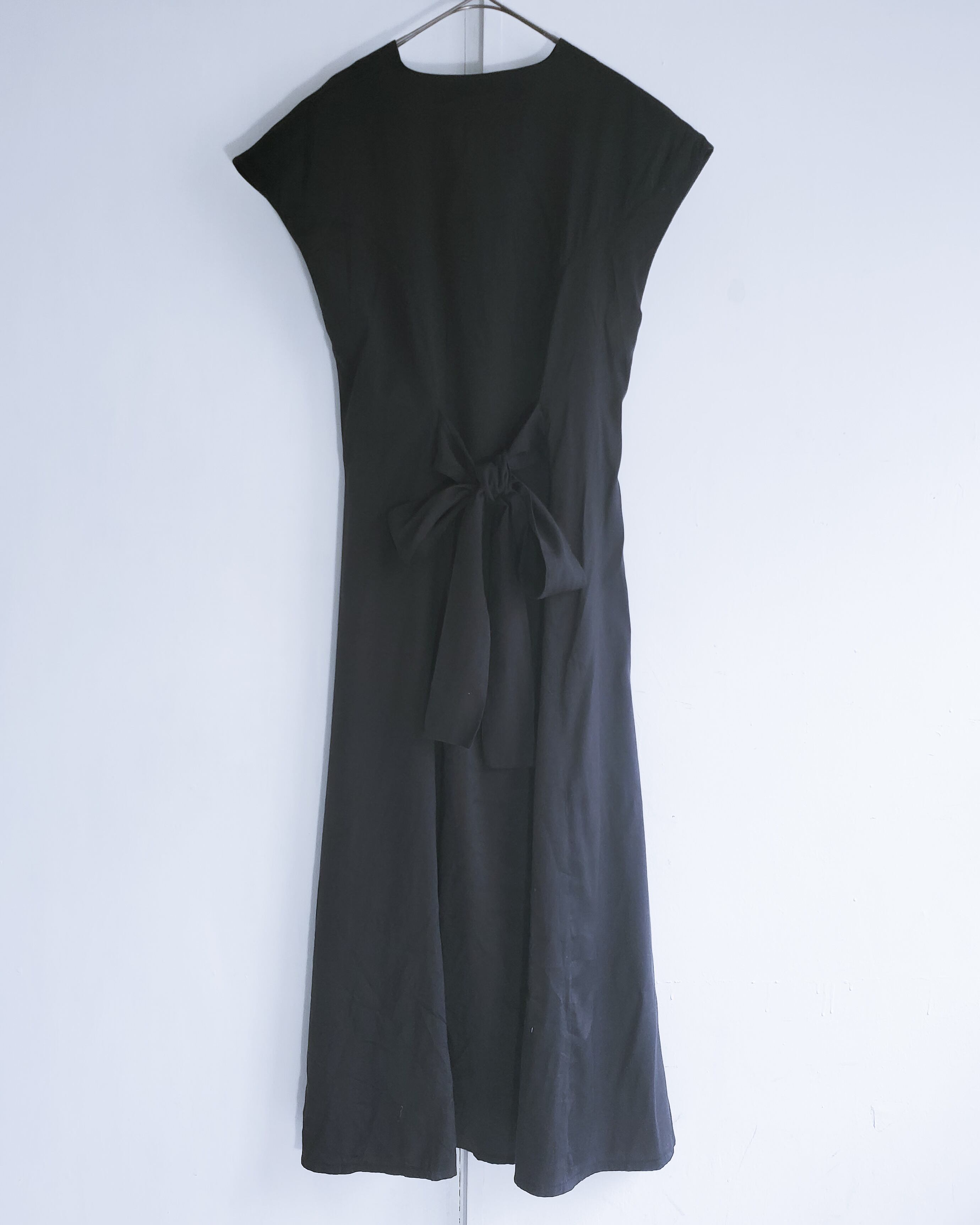フレンチスリーブのボタンダウンブラックサマーワンピース。ウエストをリボンできゅっと締めて着られます。前開きで着られるのでレイヤードコーデも◎シンプルながらシルエットきれいに着られるのが魅力です。