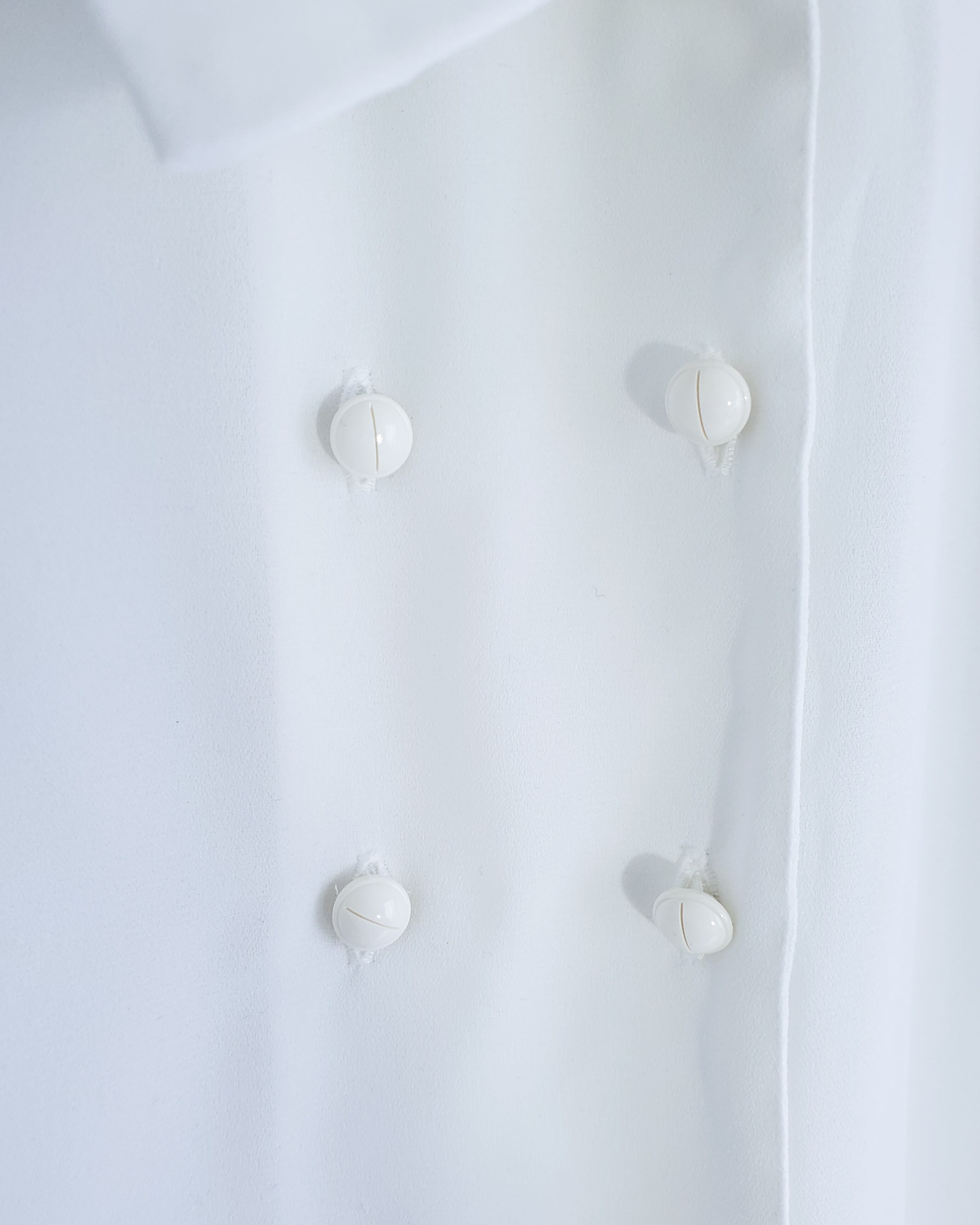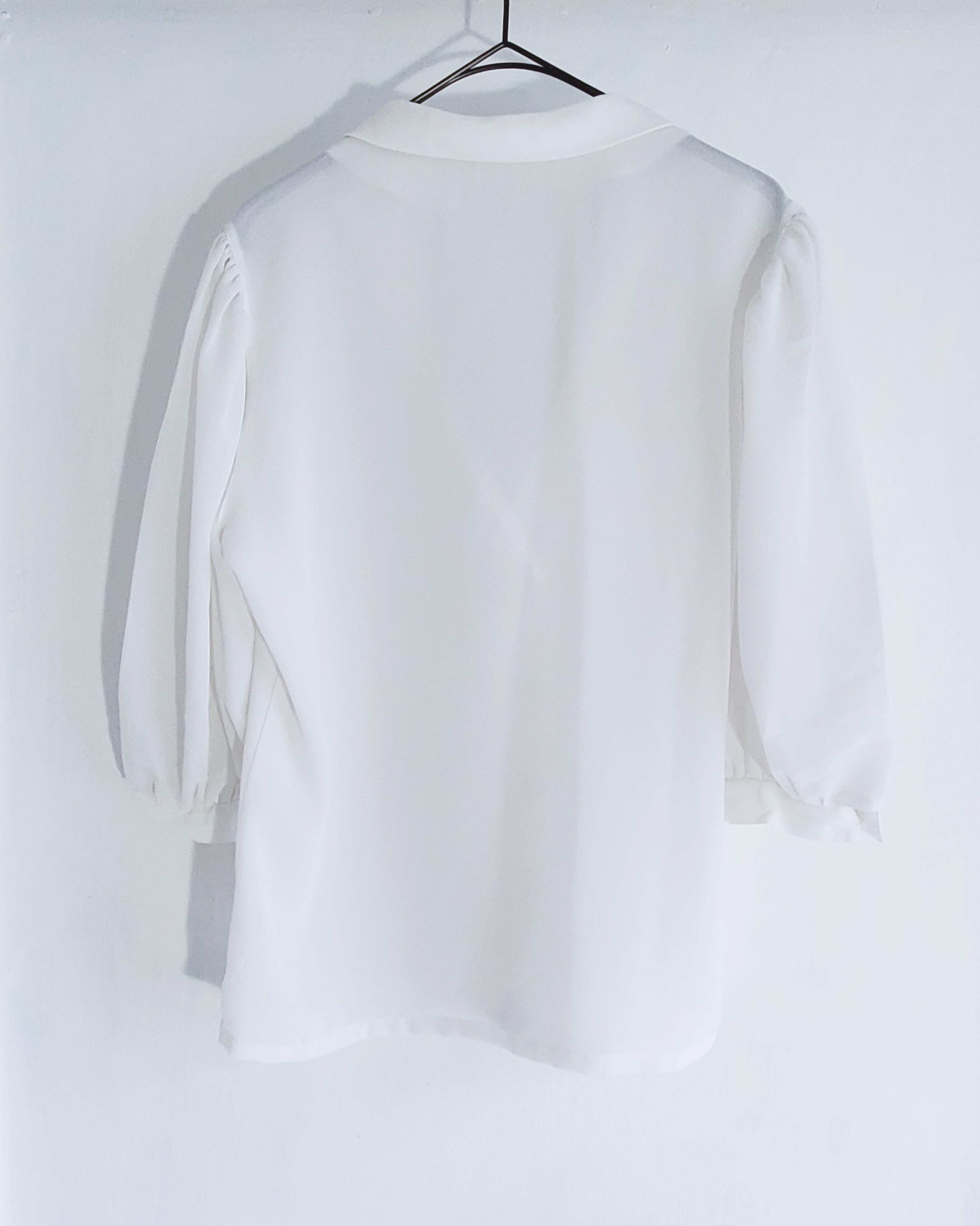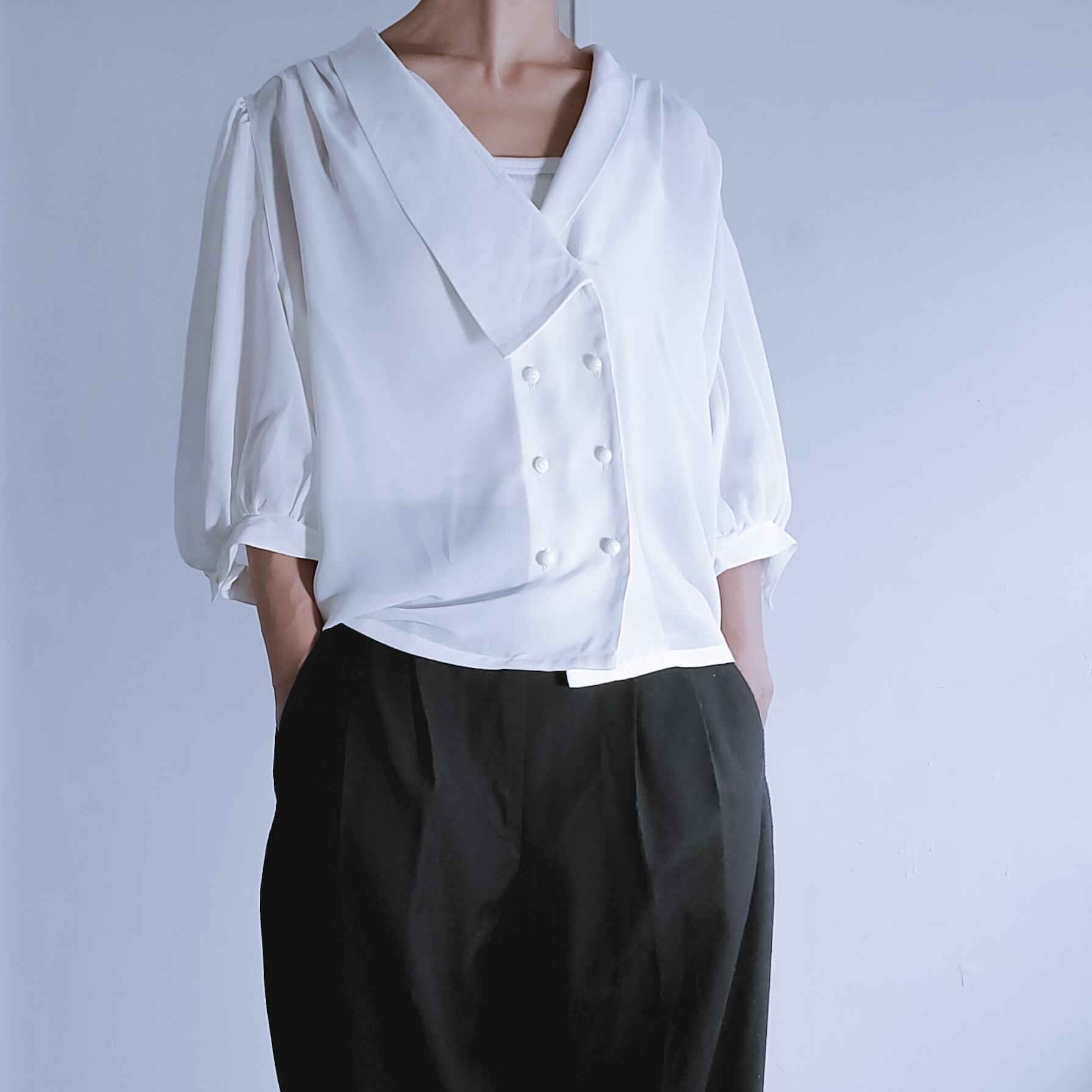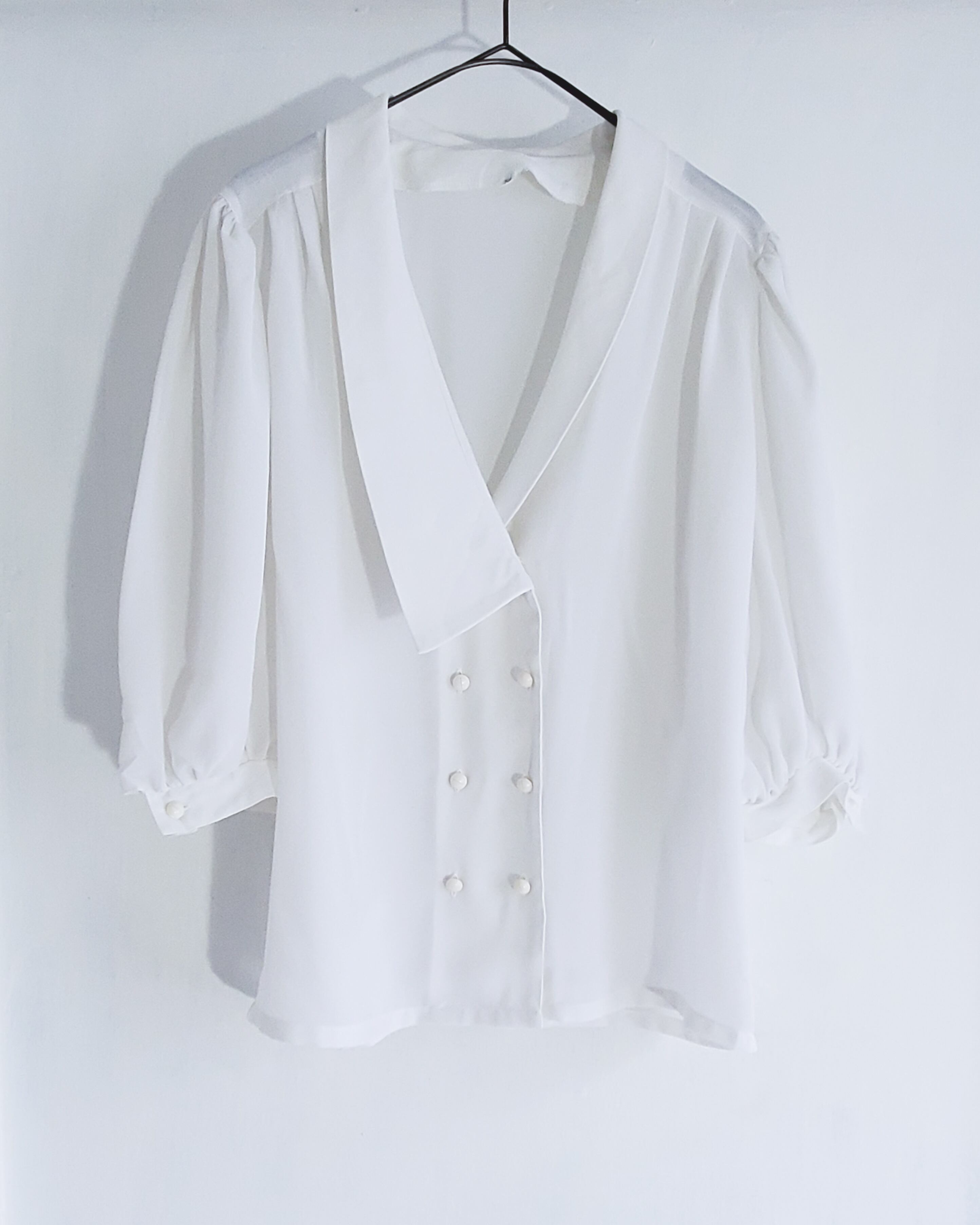 アシンメトリーな襟が印象的な白ブラウス。程よく透け感があります。ダブルボタンのデザインも魅力で、よく見るとコーヒー豆のようなプラスチックボタンもかわいくて、デザインにこだわりを感じます。肘辺りまでの袖丈も◎夏に涼しく着られるアイテムです。