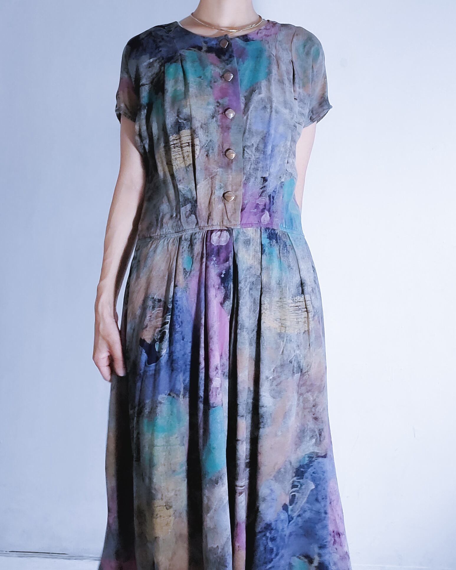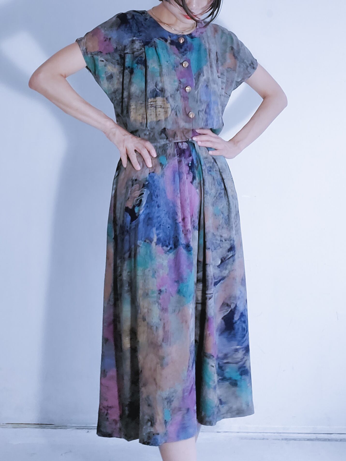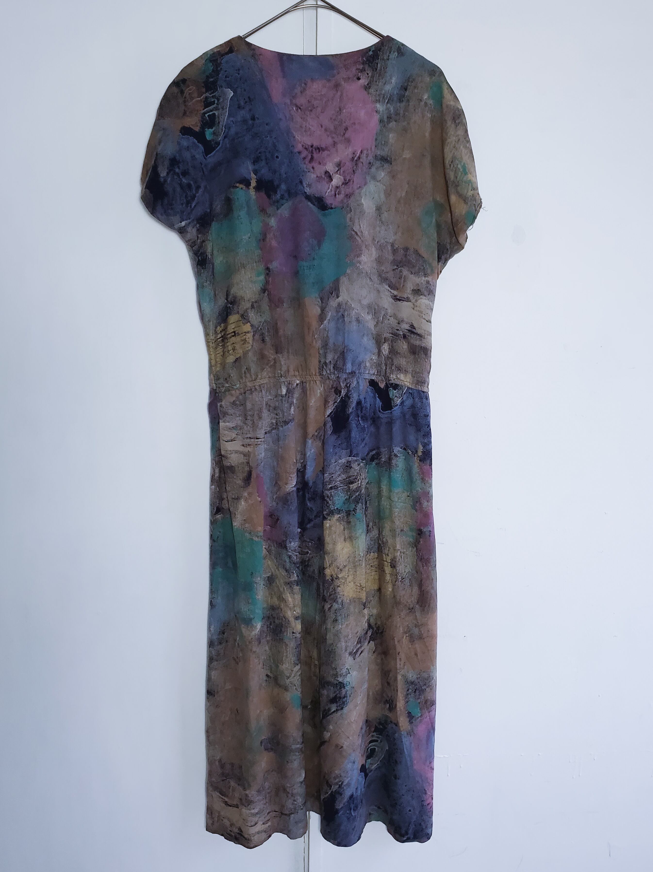 アートな柄のレーヨンワンピース。スクエアの金ボタンもすてきです。ウエストのゴムは緩めでベルトでウエストマークしても◎薄手で夏に気持ちよく着られるアイテムです。