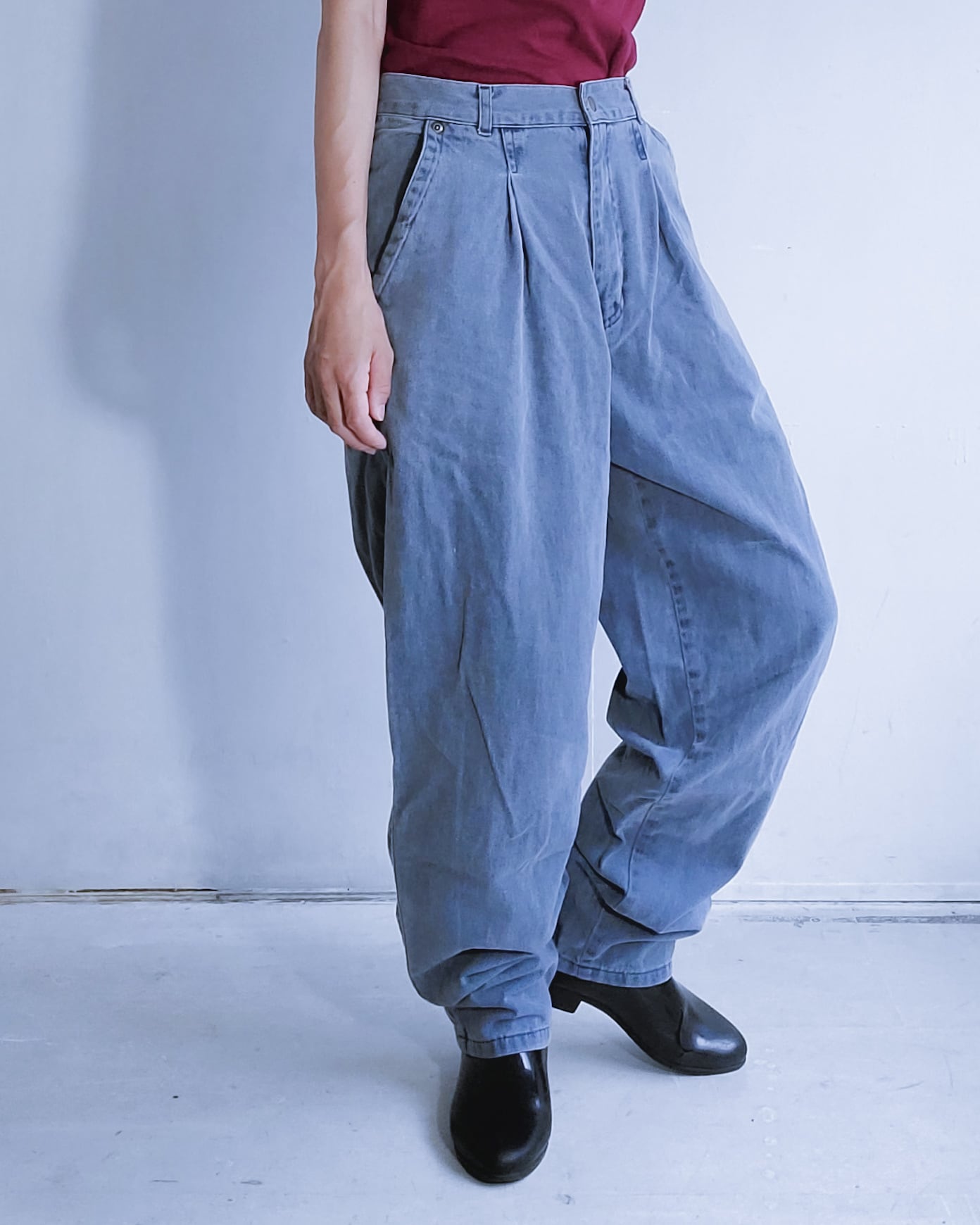 タックが入ってほんのりテーパードシルエット。色落ちしたような使用感が味わい深いです生地は固めですが経年の使用で馴染んだ程よい柔らかさがあります。ハイでもローウエストでも◎夏のボトムスに最適です。