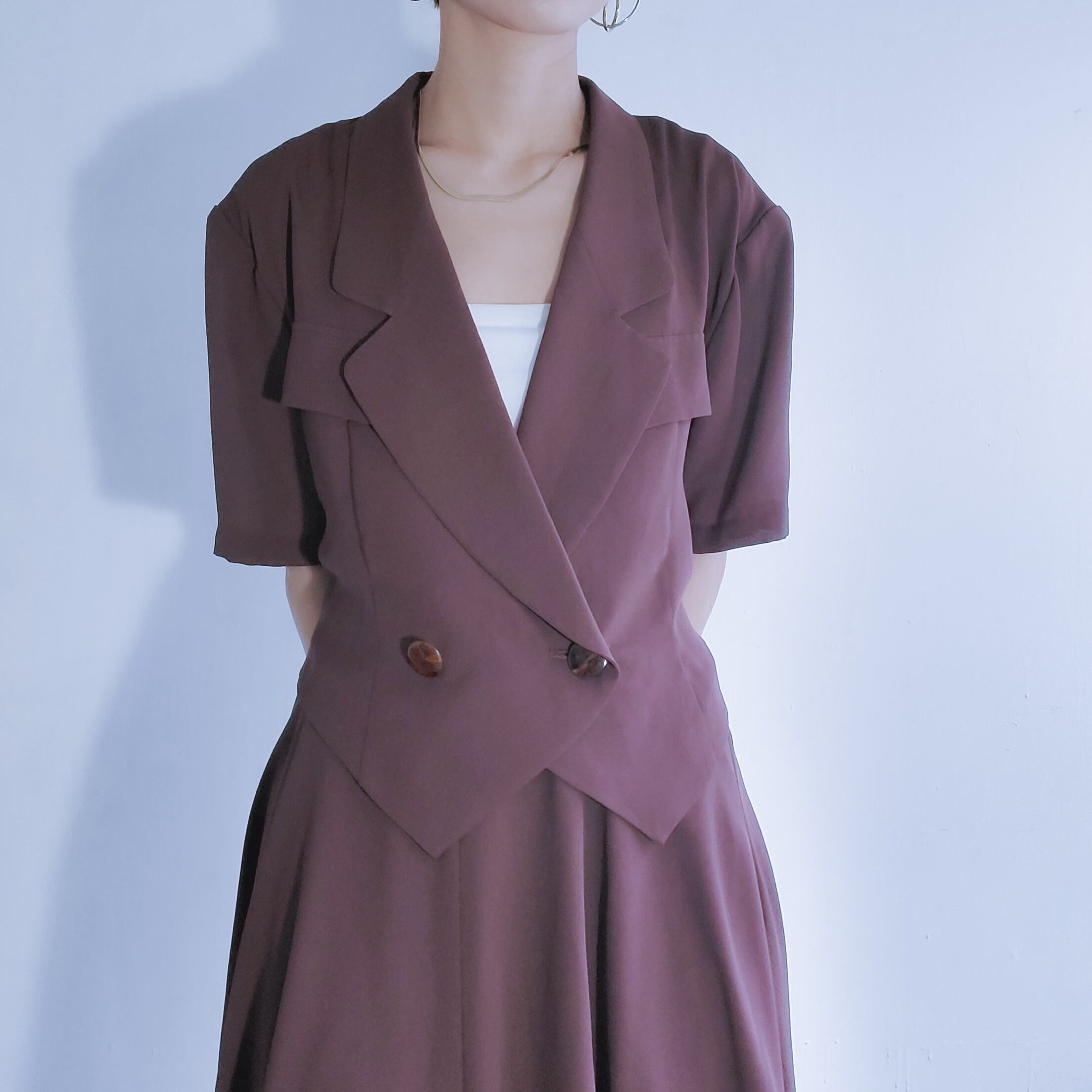 ショート丈のブラウス&スカートのセットアップ。ワントーンでシンプルでありながらダブルボタンやバックベルトなど細やかなシャープさが魅力です。