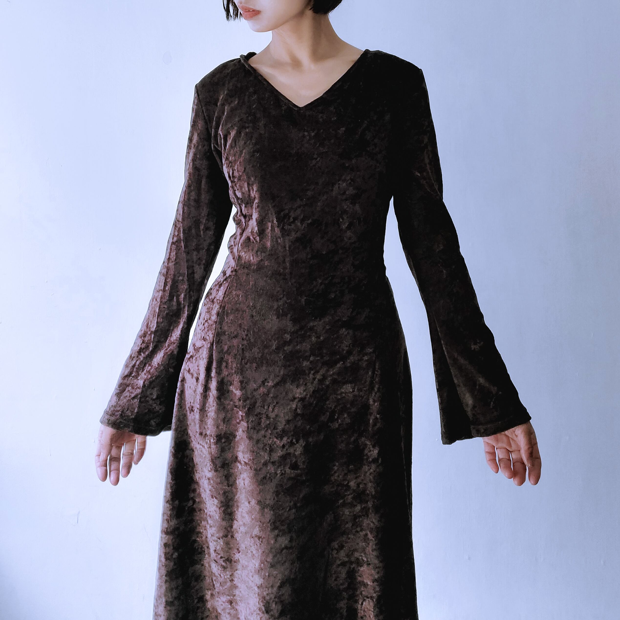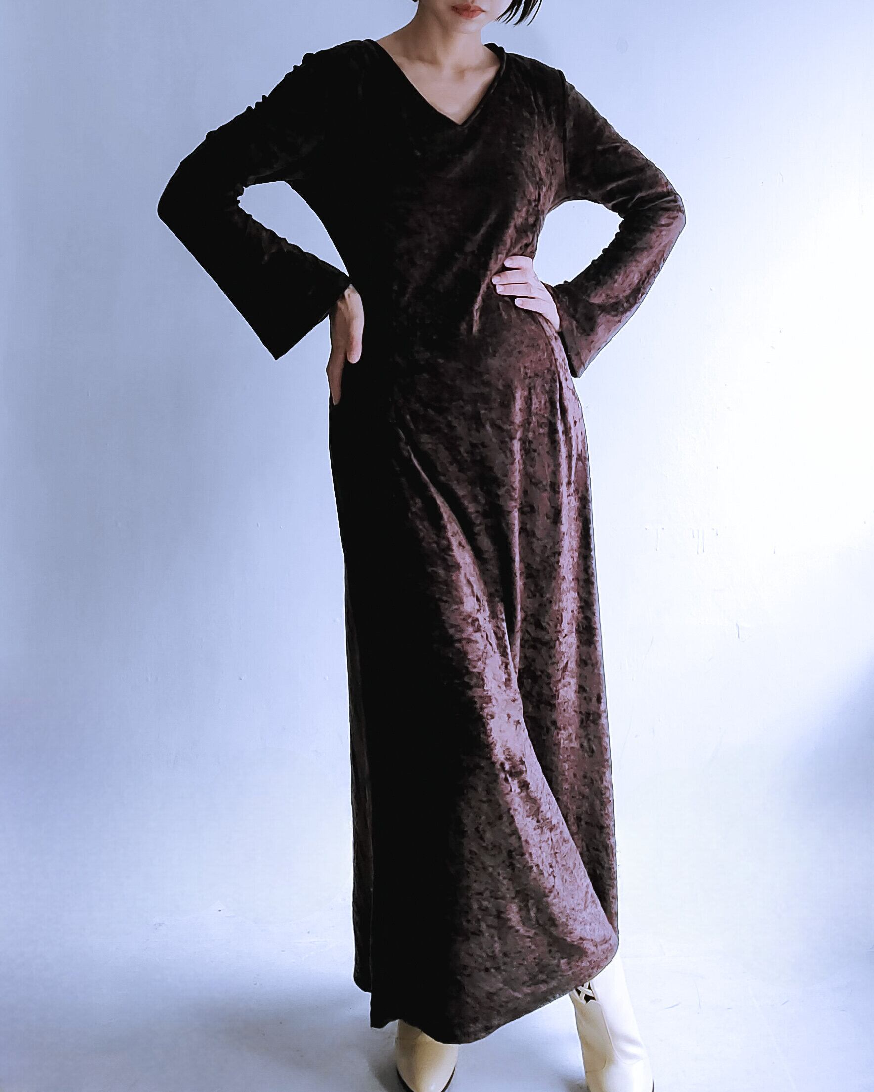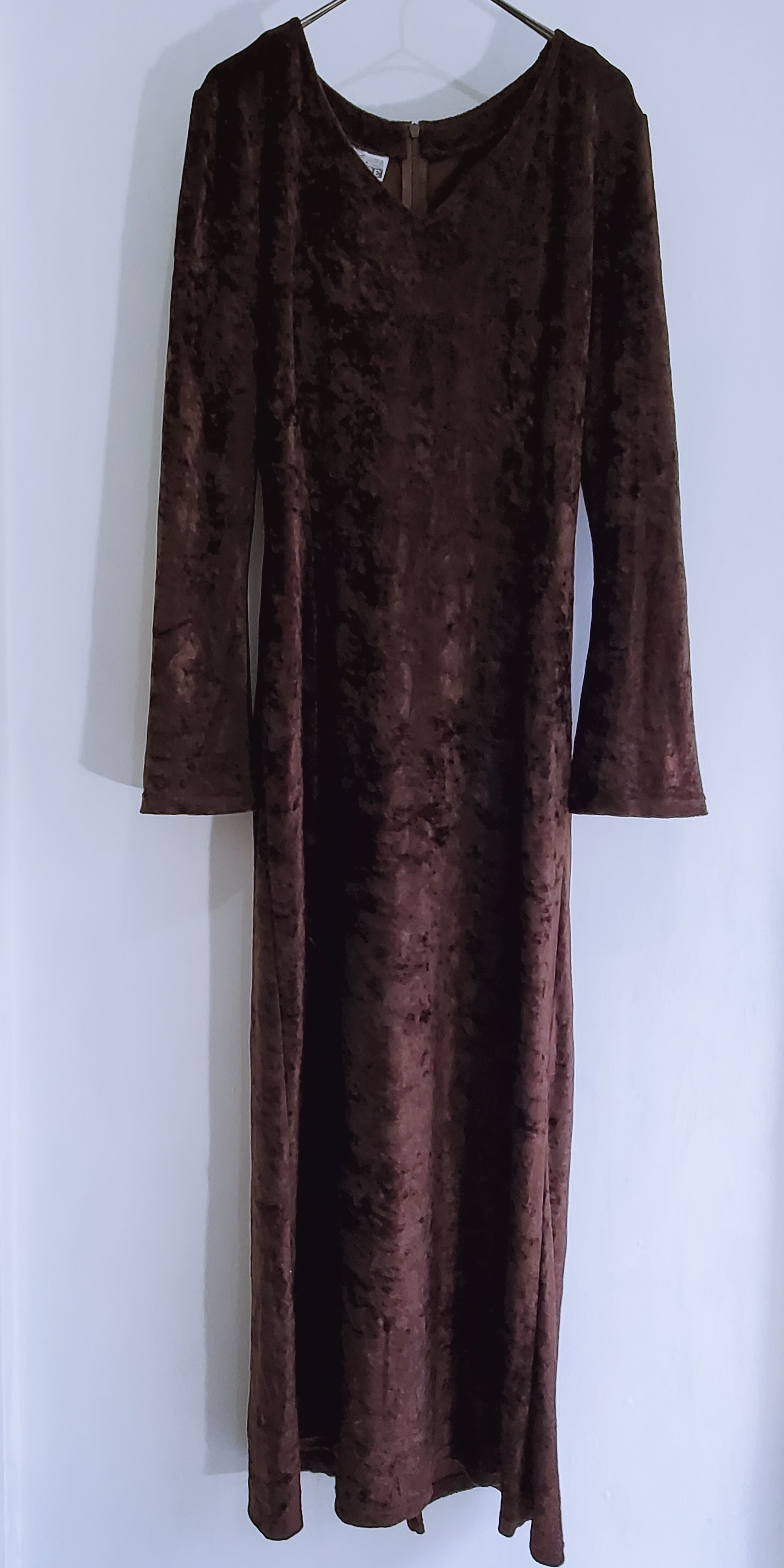 MADE IN ITALY の長袖ベロアワンピースです。一見シンプルですが袖口フレアでシルエットがとてもきれいに着られる一品です。後ろに大きめに入ったスリットがさらに魅力。
