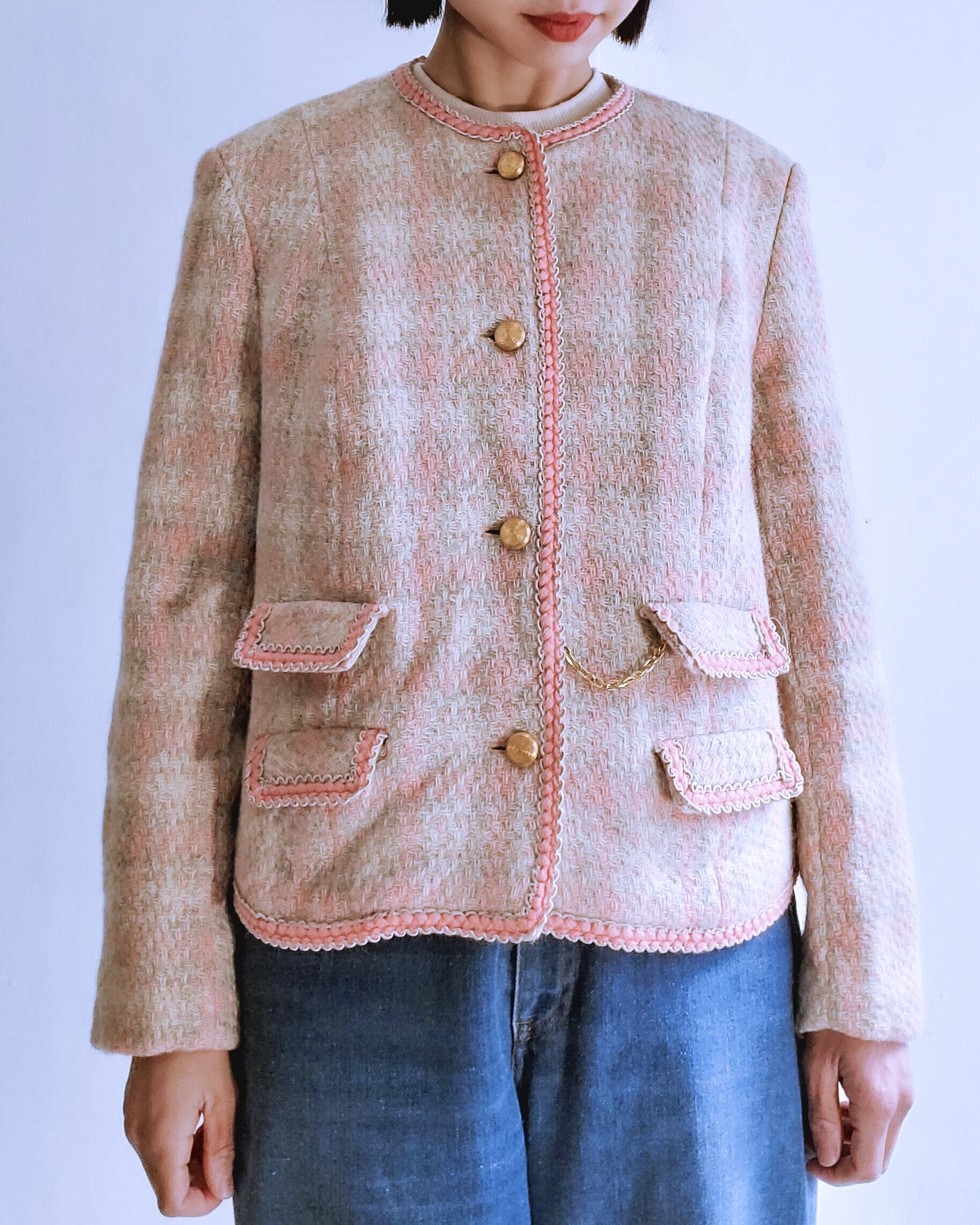ピンク、ベージュ、グレーの淡い色味が春らしいツイードジャケット。三つ編みのような縁取りのリボンやポケットのチェーンなど品よく一層華やかです。入学式や入社式などオケージョンシーンにぴったりなアイテム。デニムやカーゴパンツでカジュアルダウンしてデイリーユースも◎