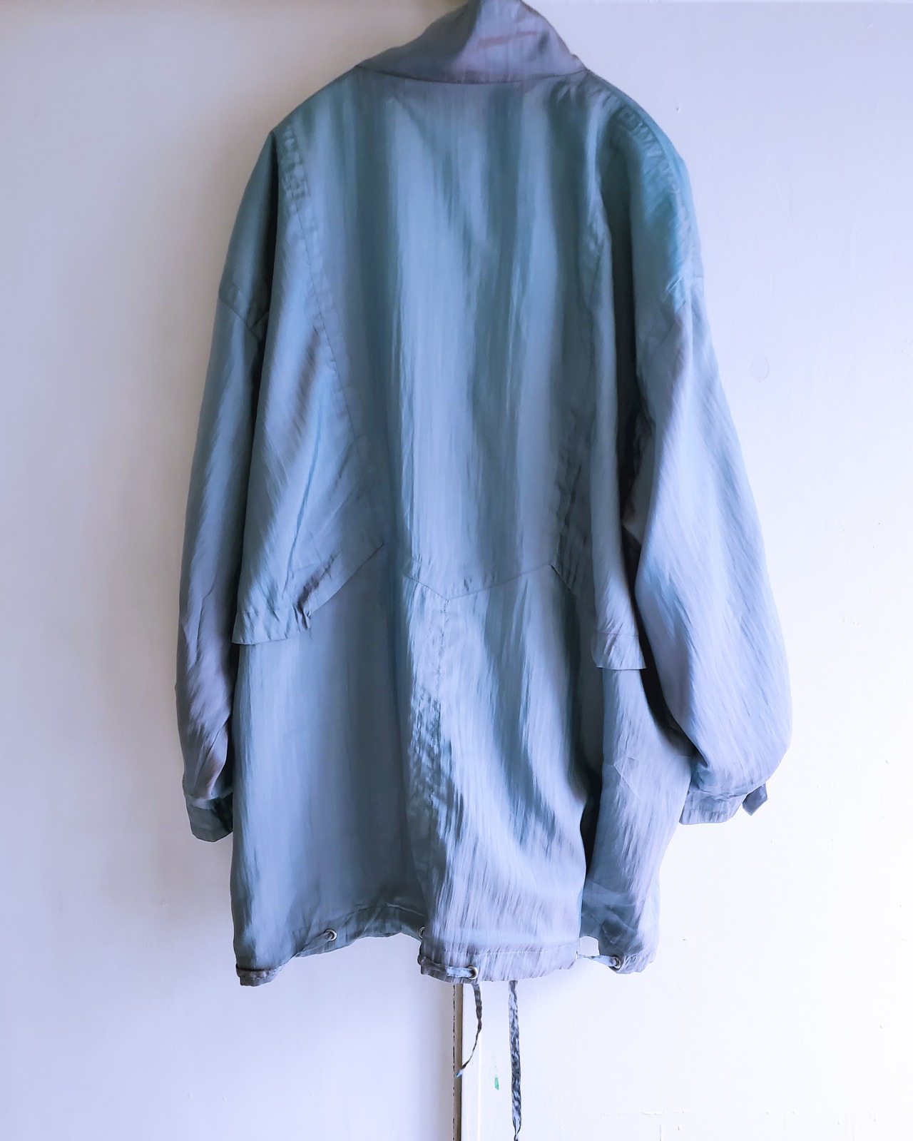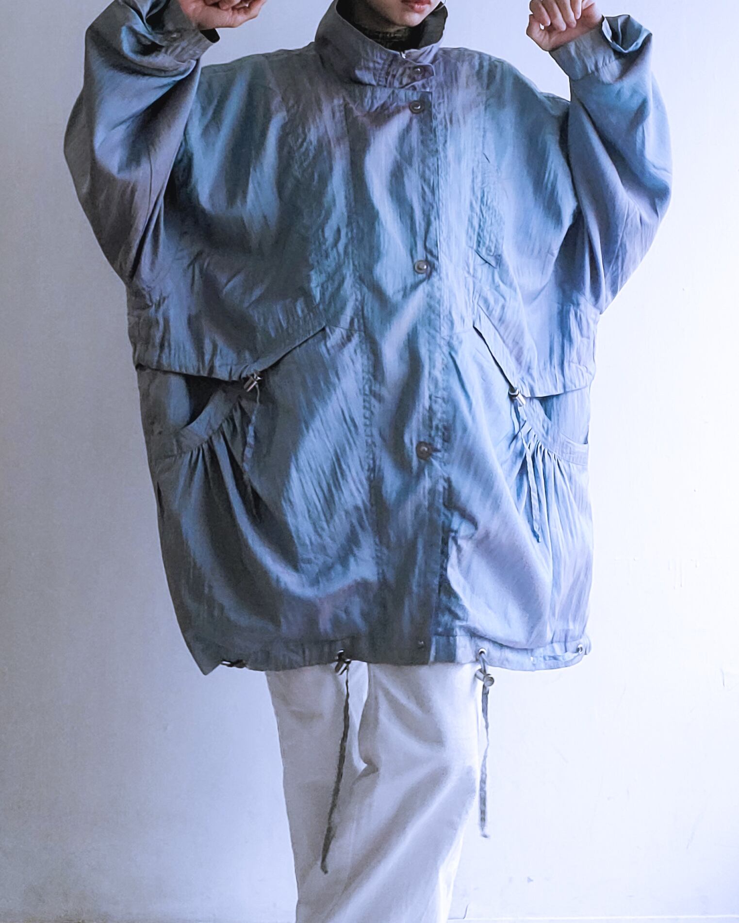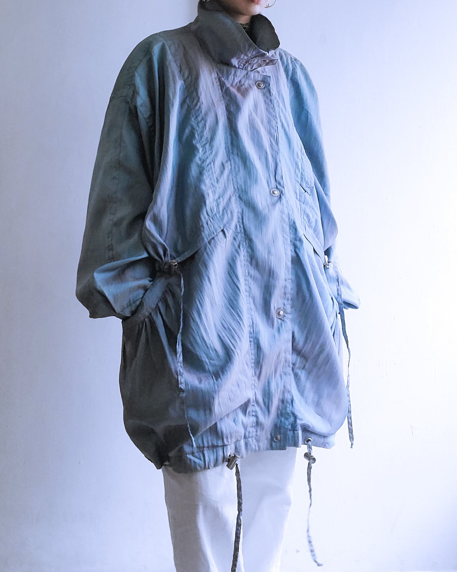 光沢のあるオーロラカラーが魅力なドローストリングコート。軽く着られるので春コートとして活用できそうです。サイズは大きめでジェンダーレスにお楽しみいただけます。絞りをきかせてアレンジも◎