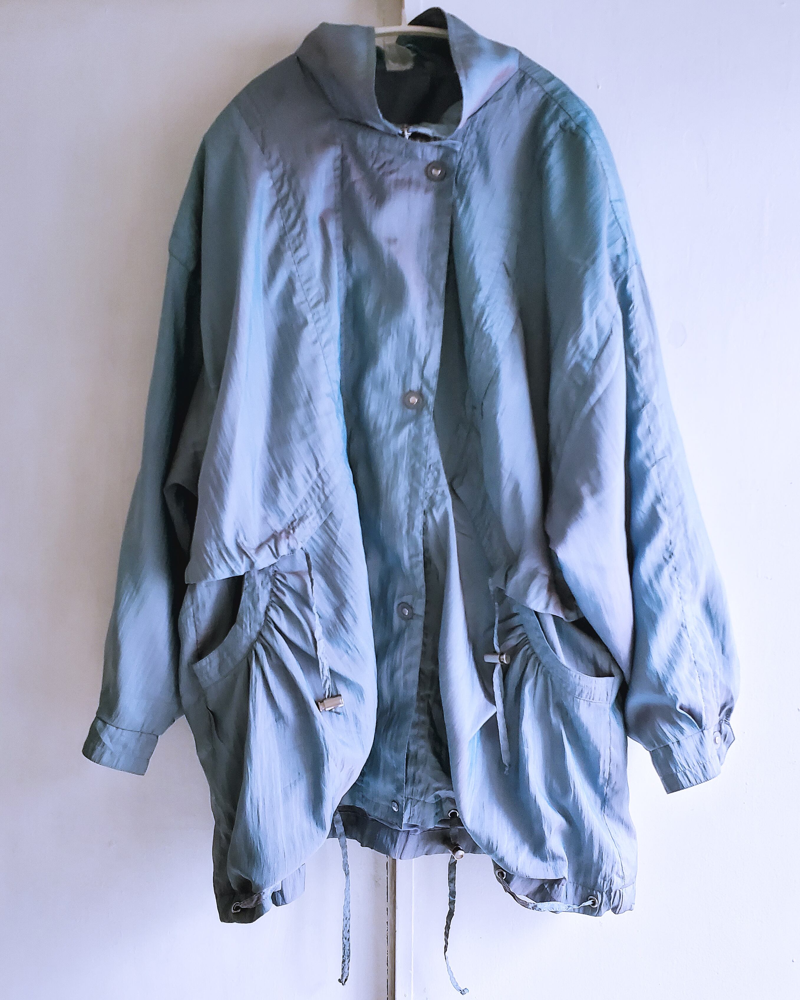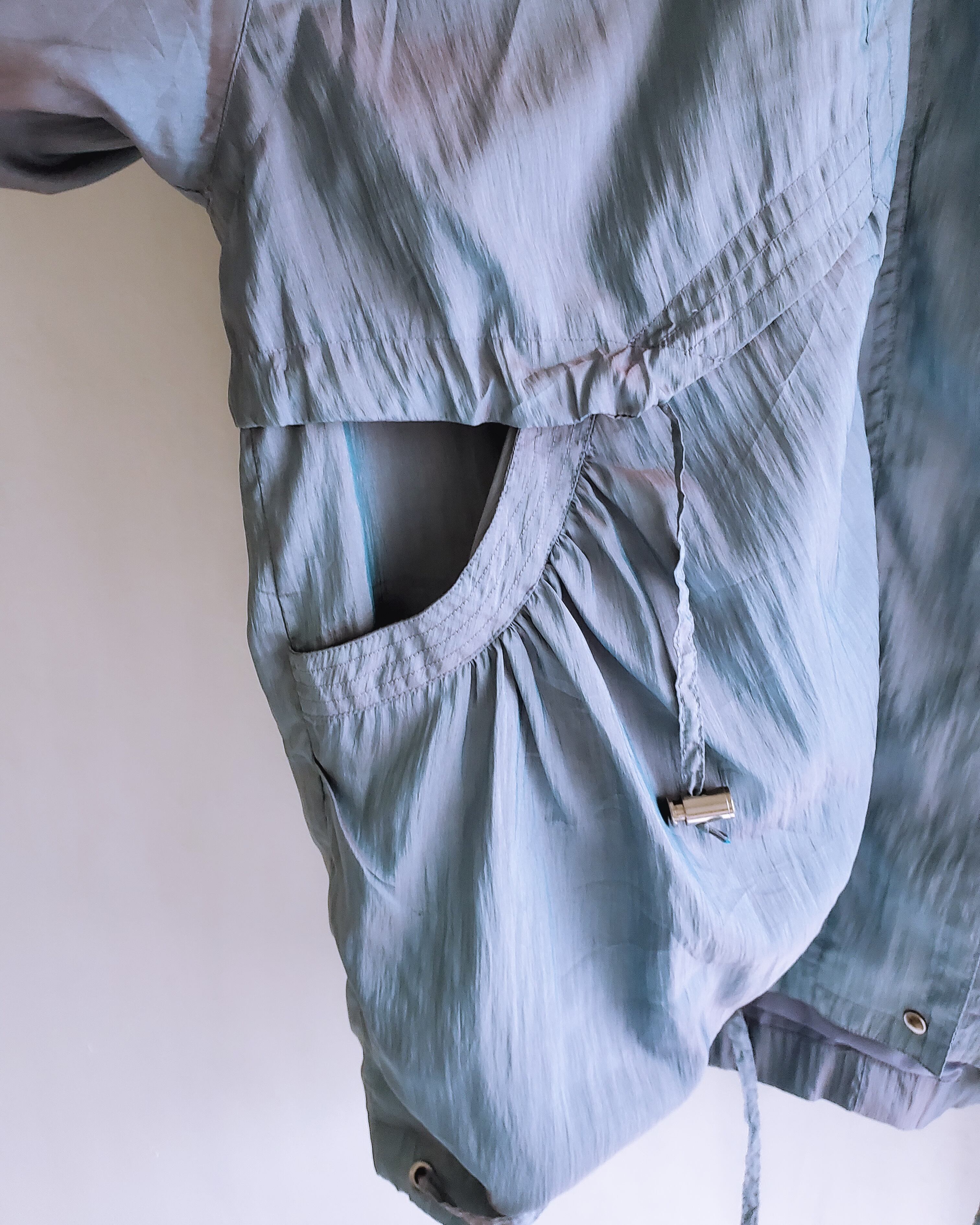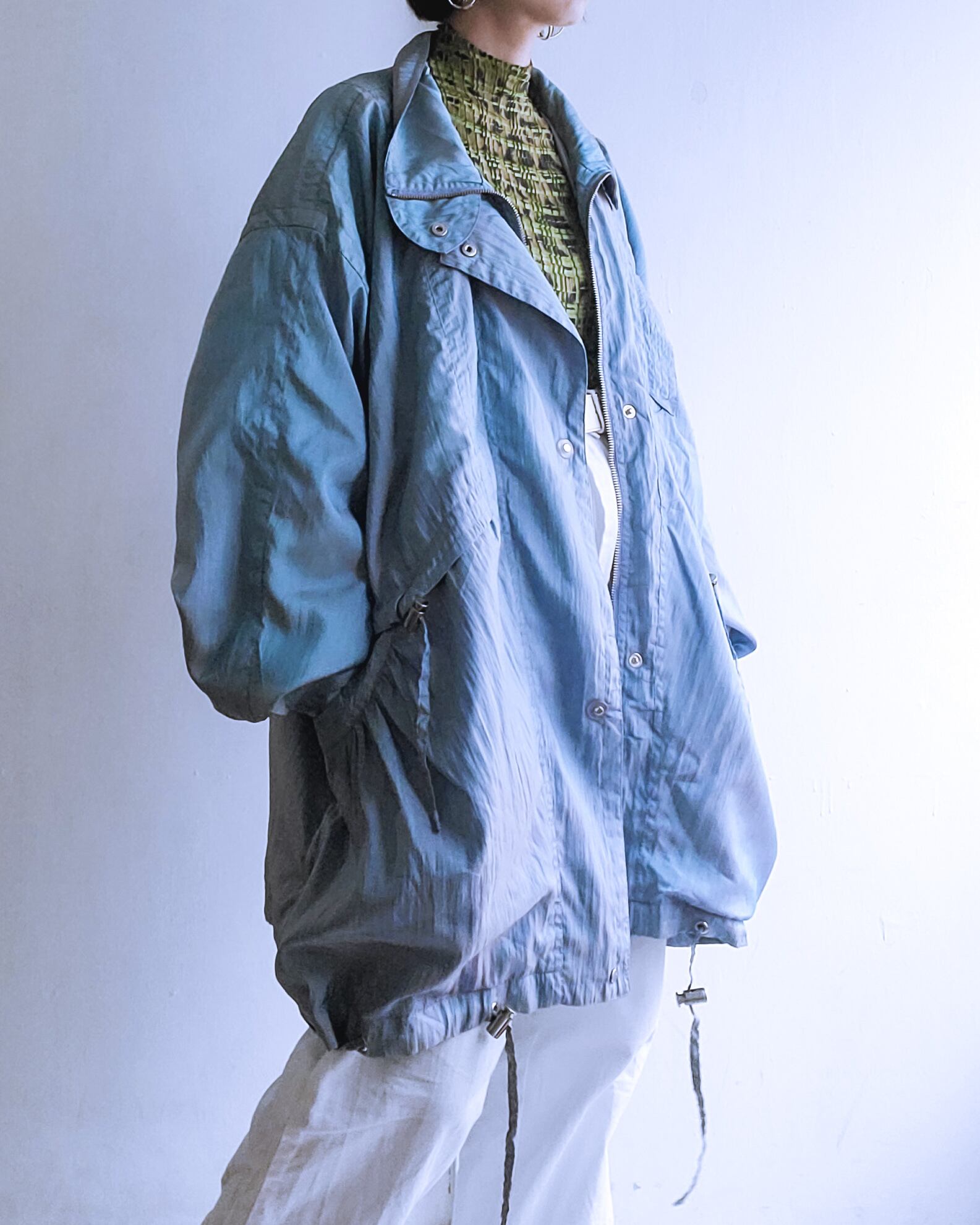光沢のあるオーロラカラーが魅力なドローストリングコート。軽く着られるので春コートとして活用できそうです。サイズは大きめでジェンダーレスにお楽しみいただけます。絞りをきかせてアレンジも◎
