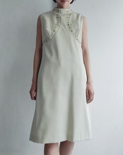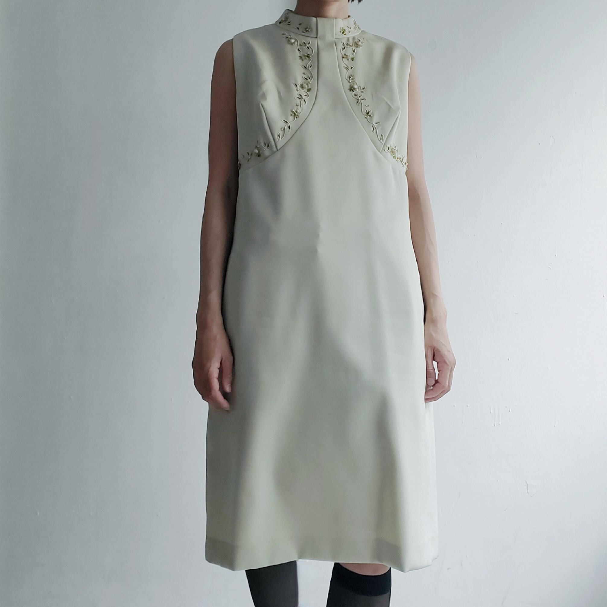 オランダから入荷したビーズ刺繍のミニワンピース。黄緑色の上質な生地感にお花を模したビーズ刺繍が品よくあしらわれています。タイツやレイヤードコーデでカジュアルダウンしてデイリーに着たり、結婚式や会食など、かしこまった席にも最適なドレスです。