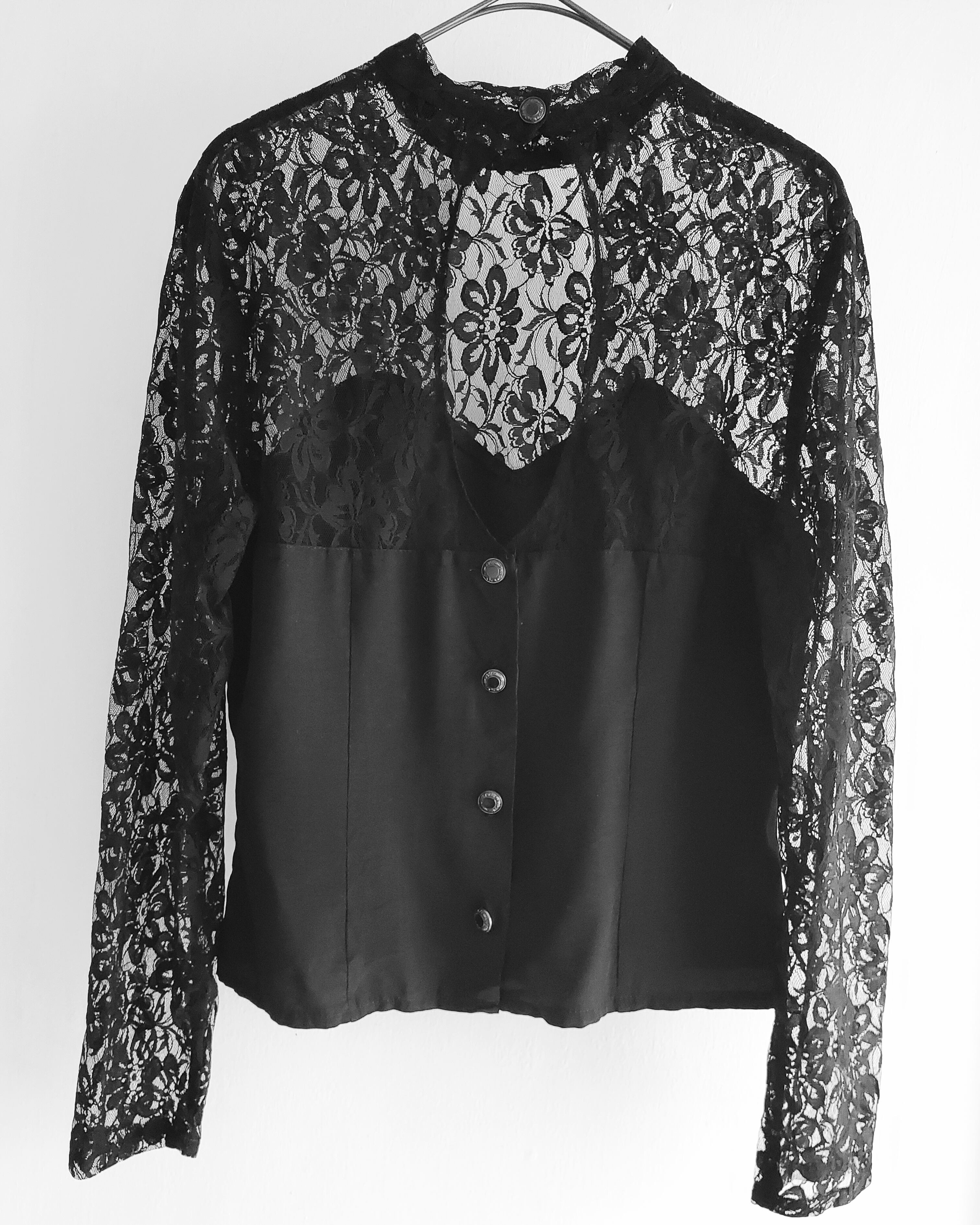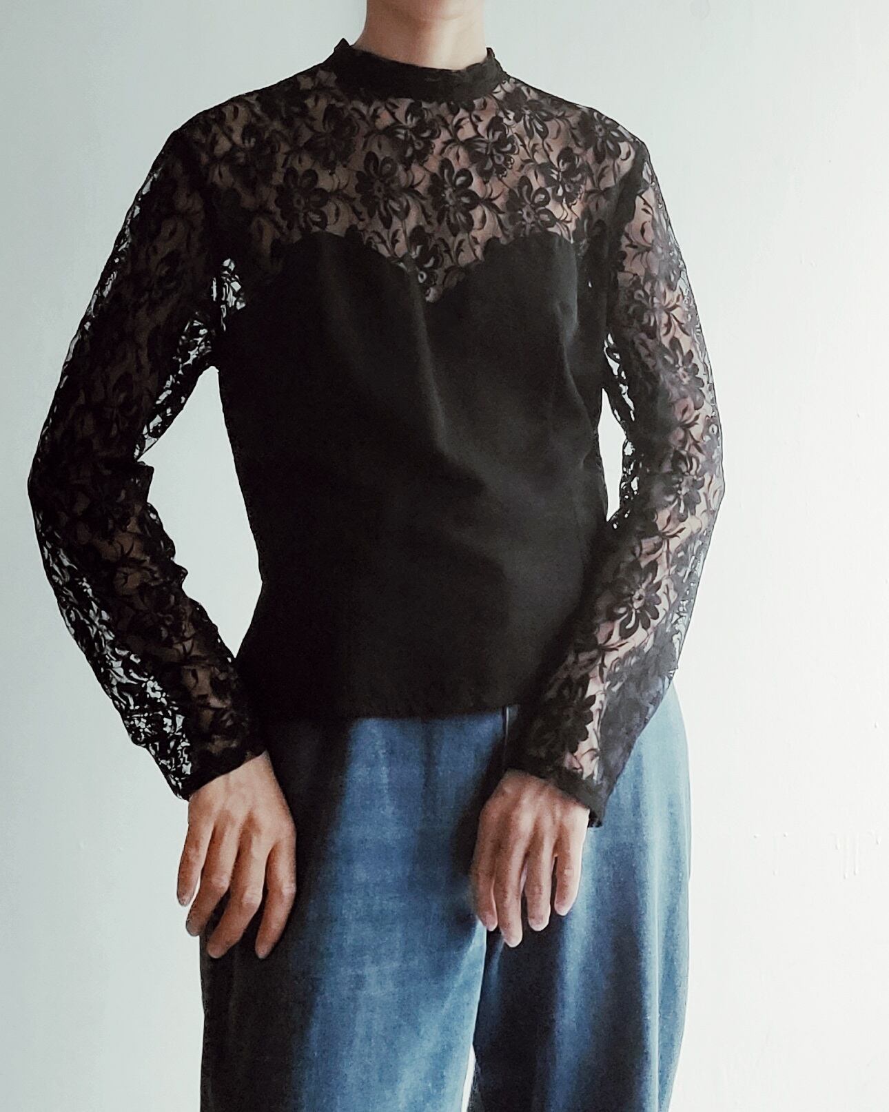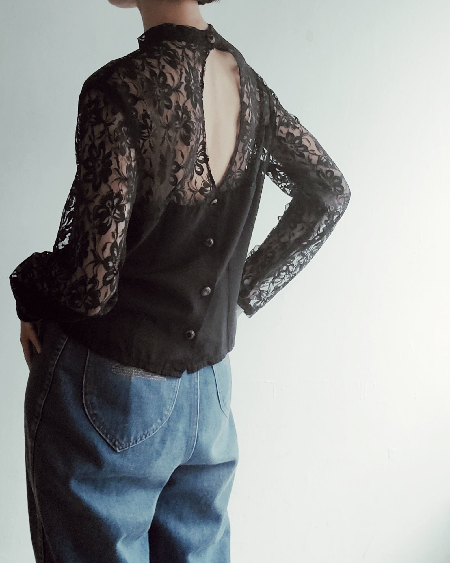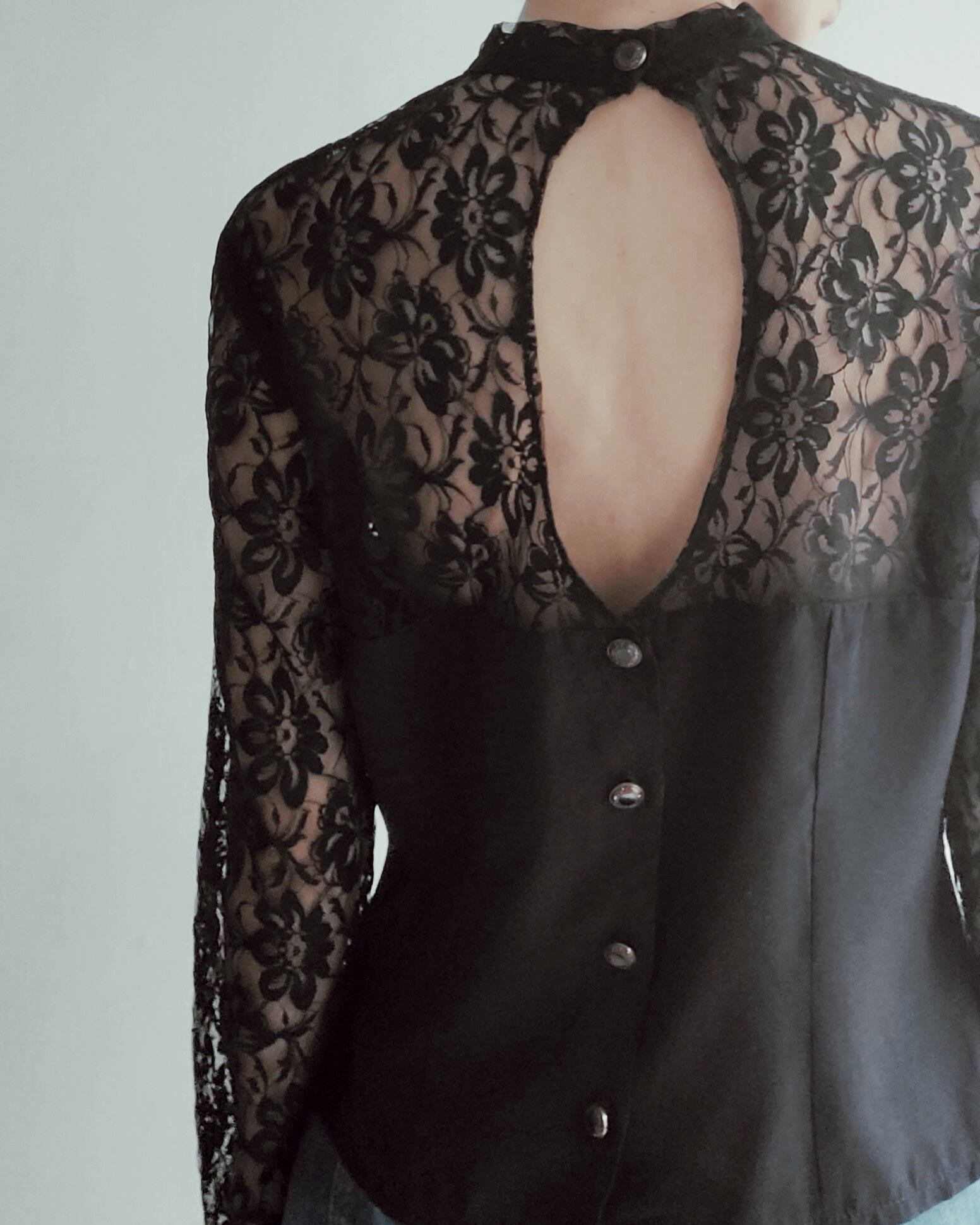 背中が開いたデザインのレーストップ。デコルテから腕にかけてのレースが魅力です。ドレスアップもカジュアルダウンも楽しめるアイテムです。
