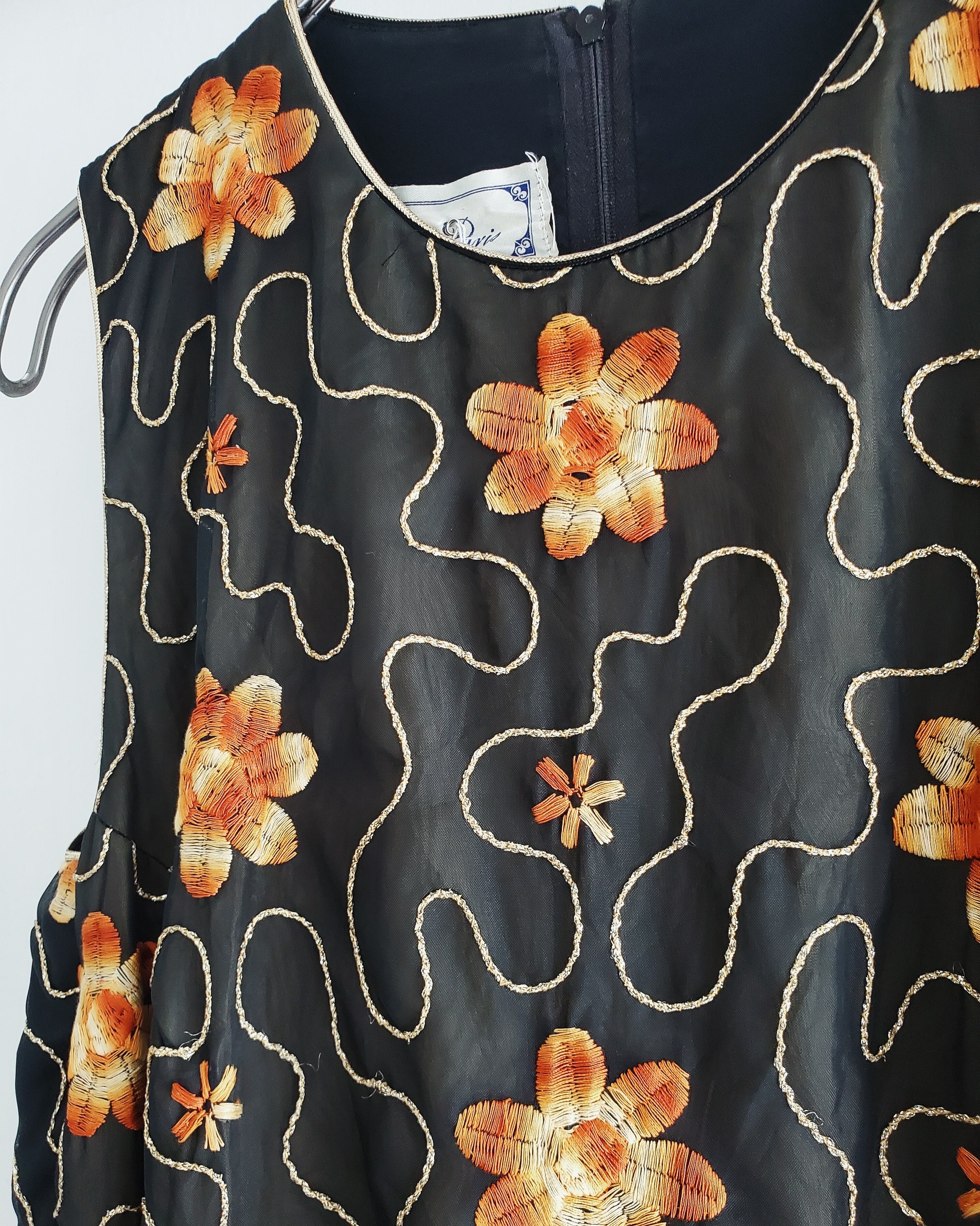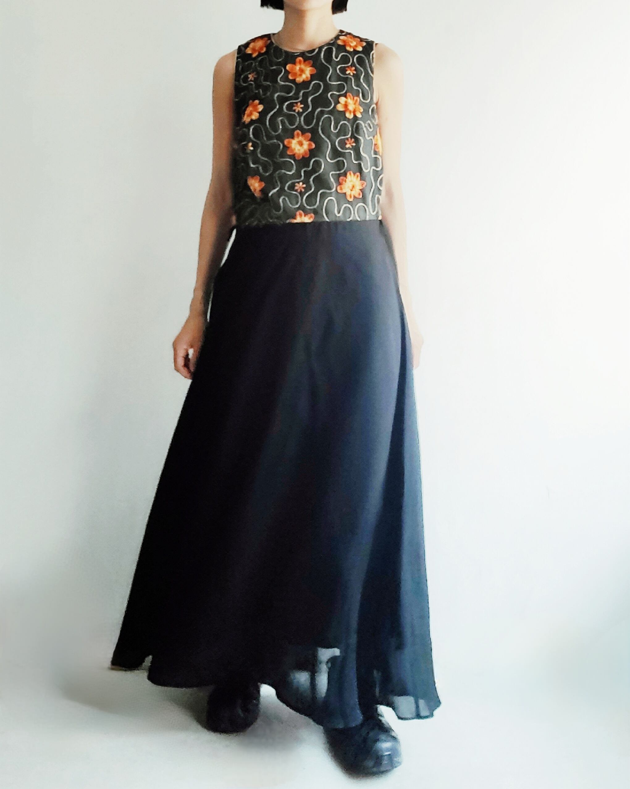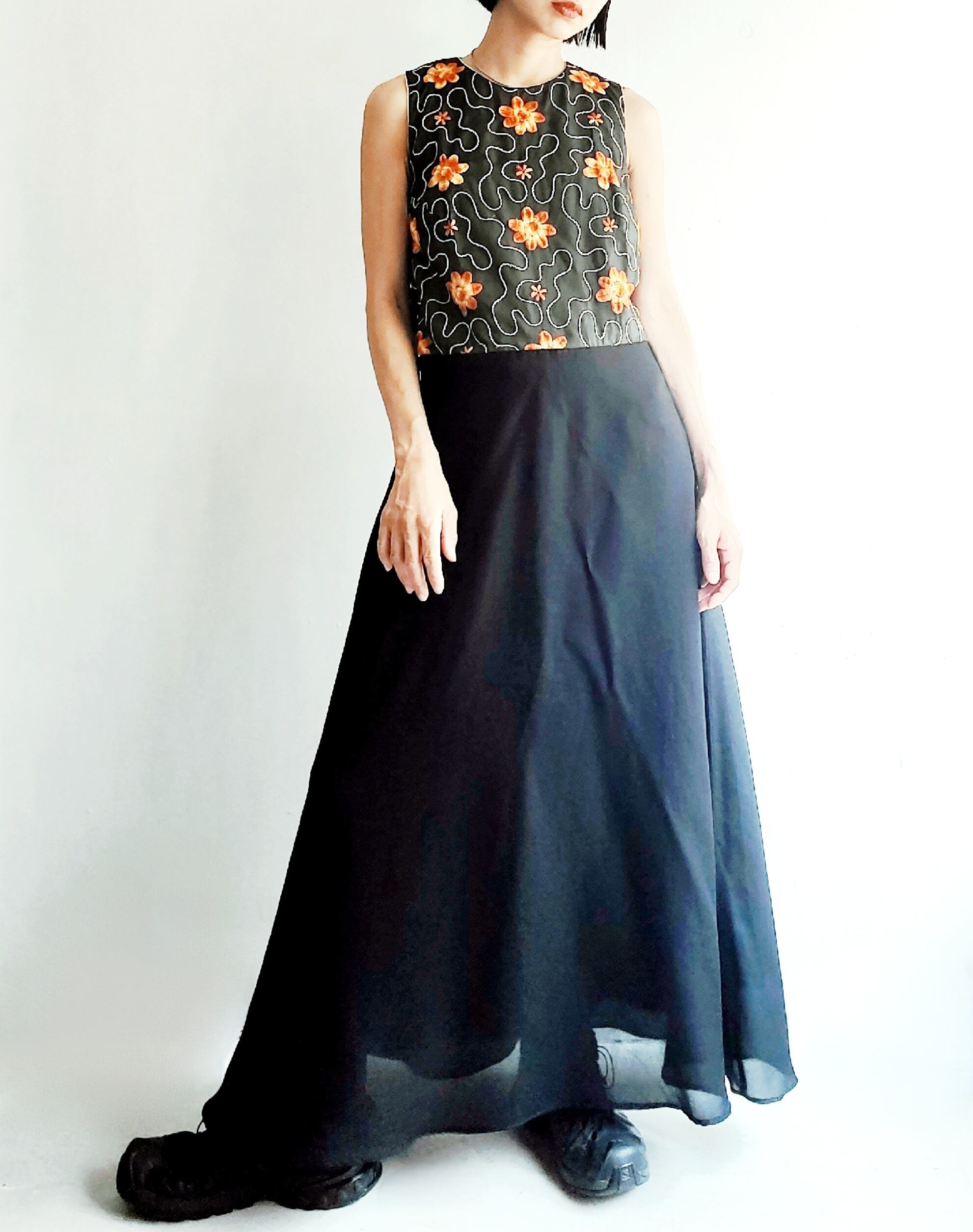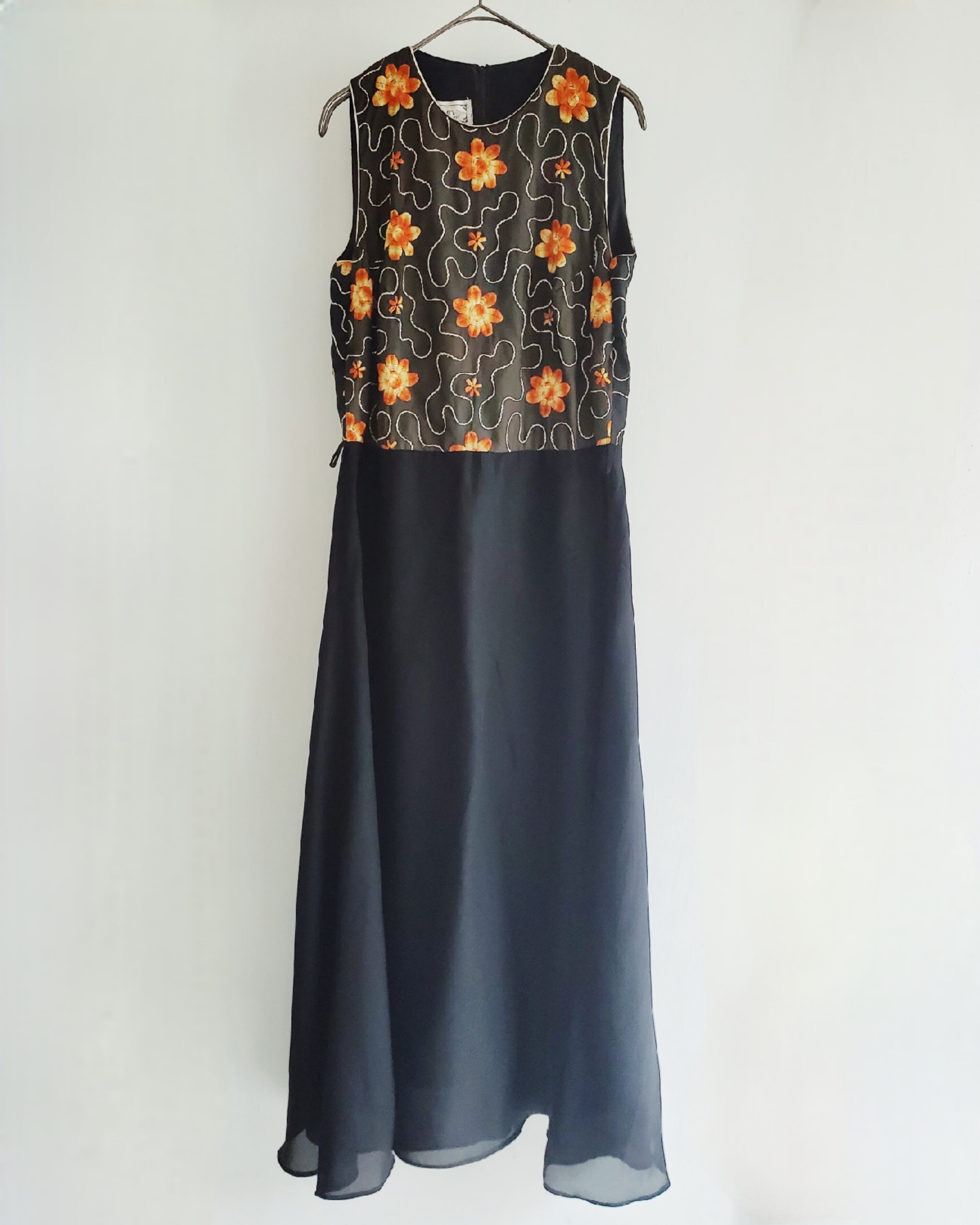 上半身は花柄の刺繍と金糸があしらわれ、スカートはたっぷりと生地を使っており揺れ動くスカートの裾と軽やかなシアー感が魅力です。