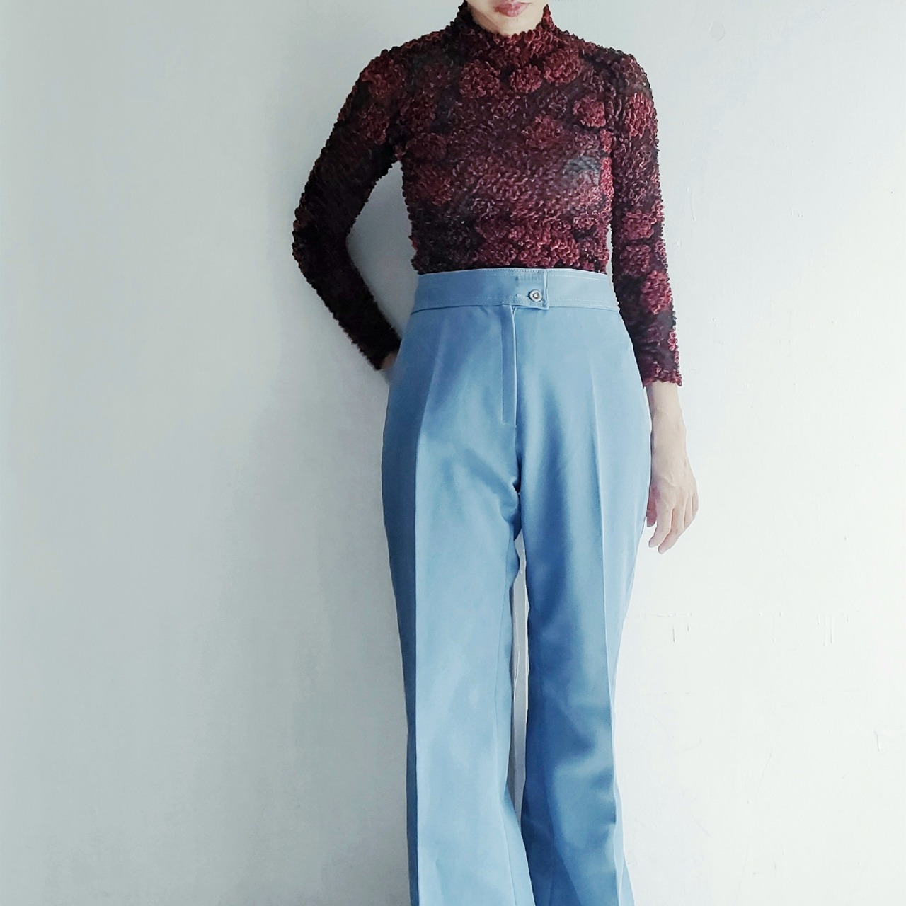 透け感のある黒い生地にベロアの花柄の秋冬ポップコーントップス。伸縮性があるのでフリーサイズで着られます。袖は7部丈くらいです。