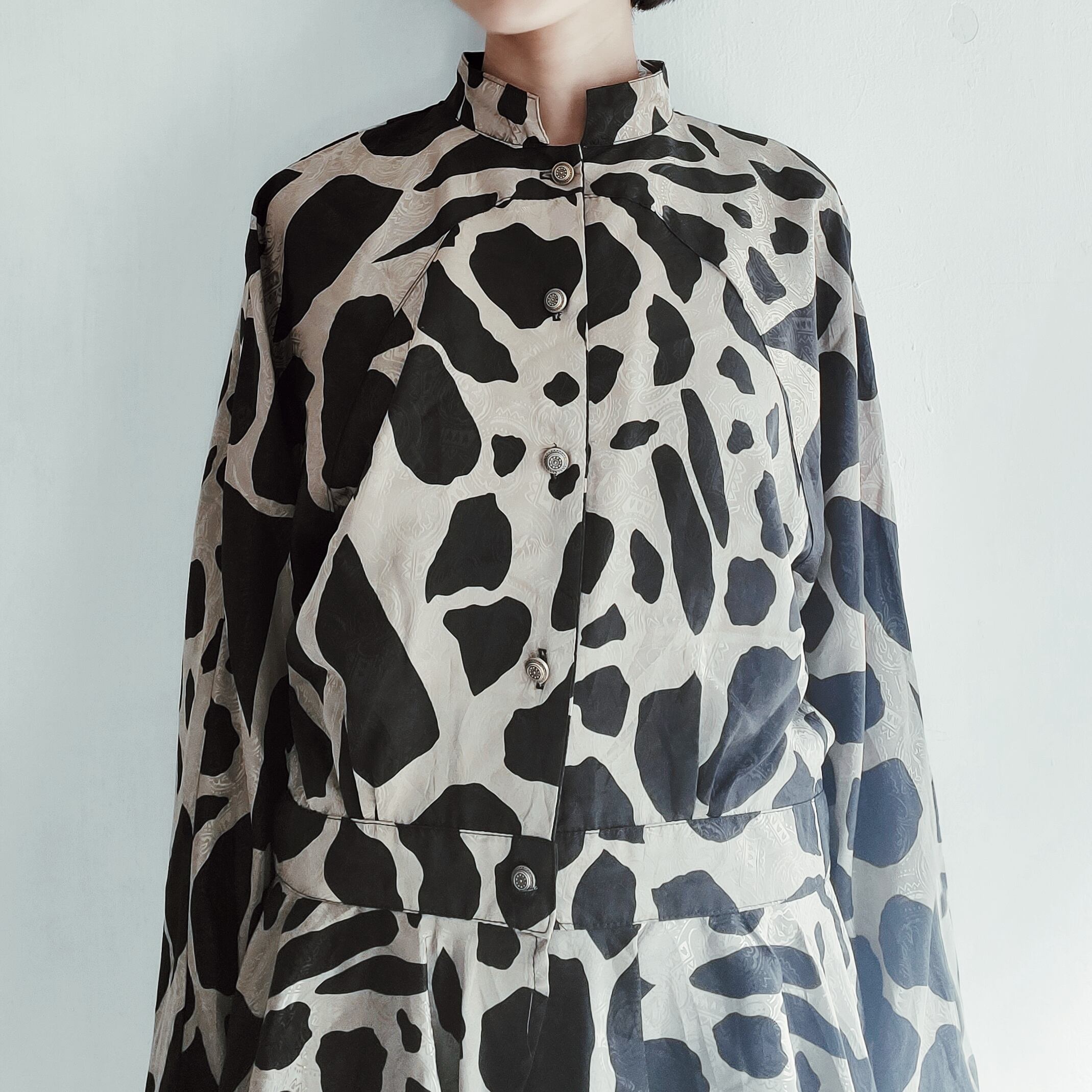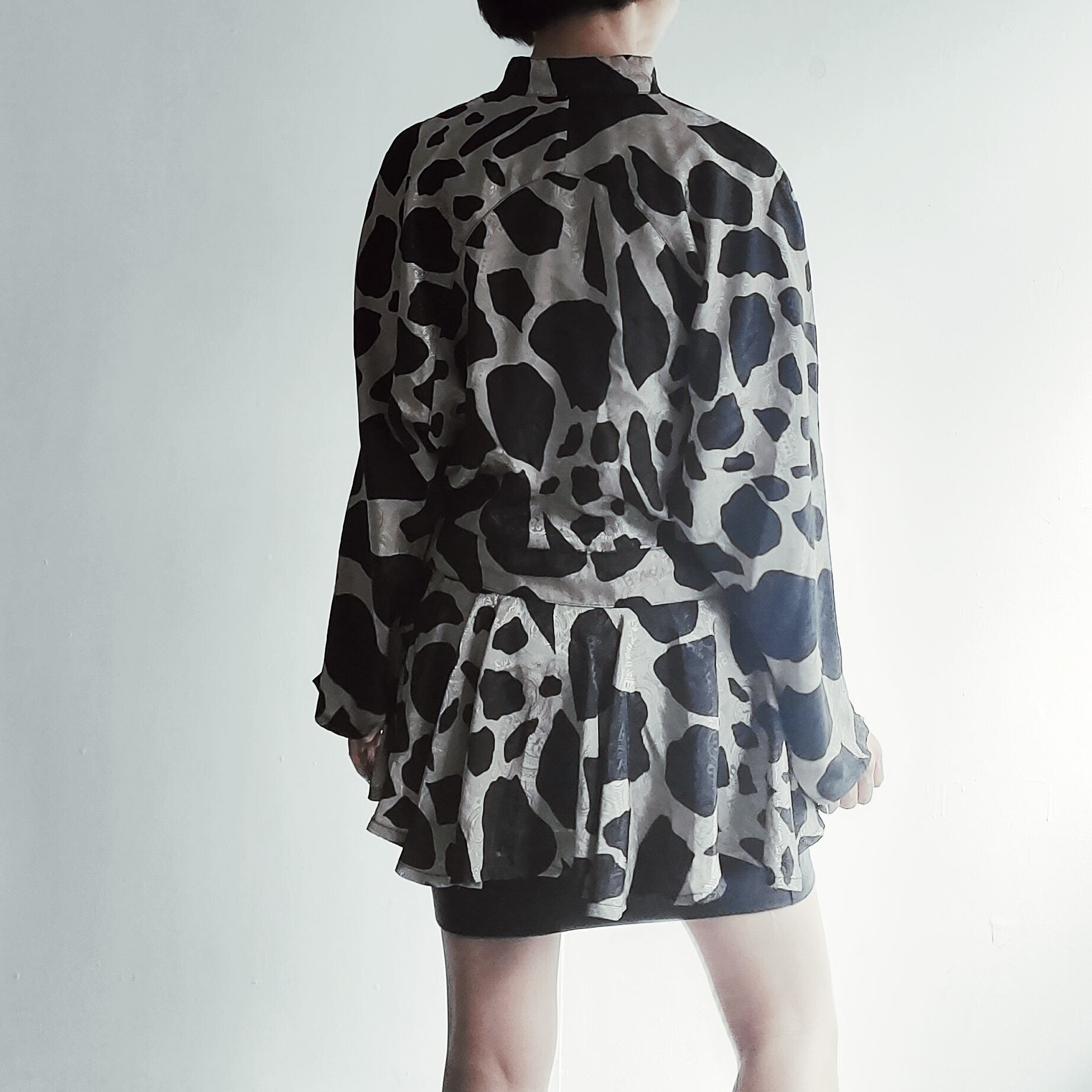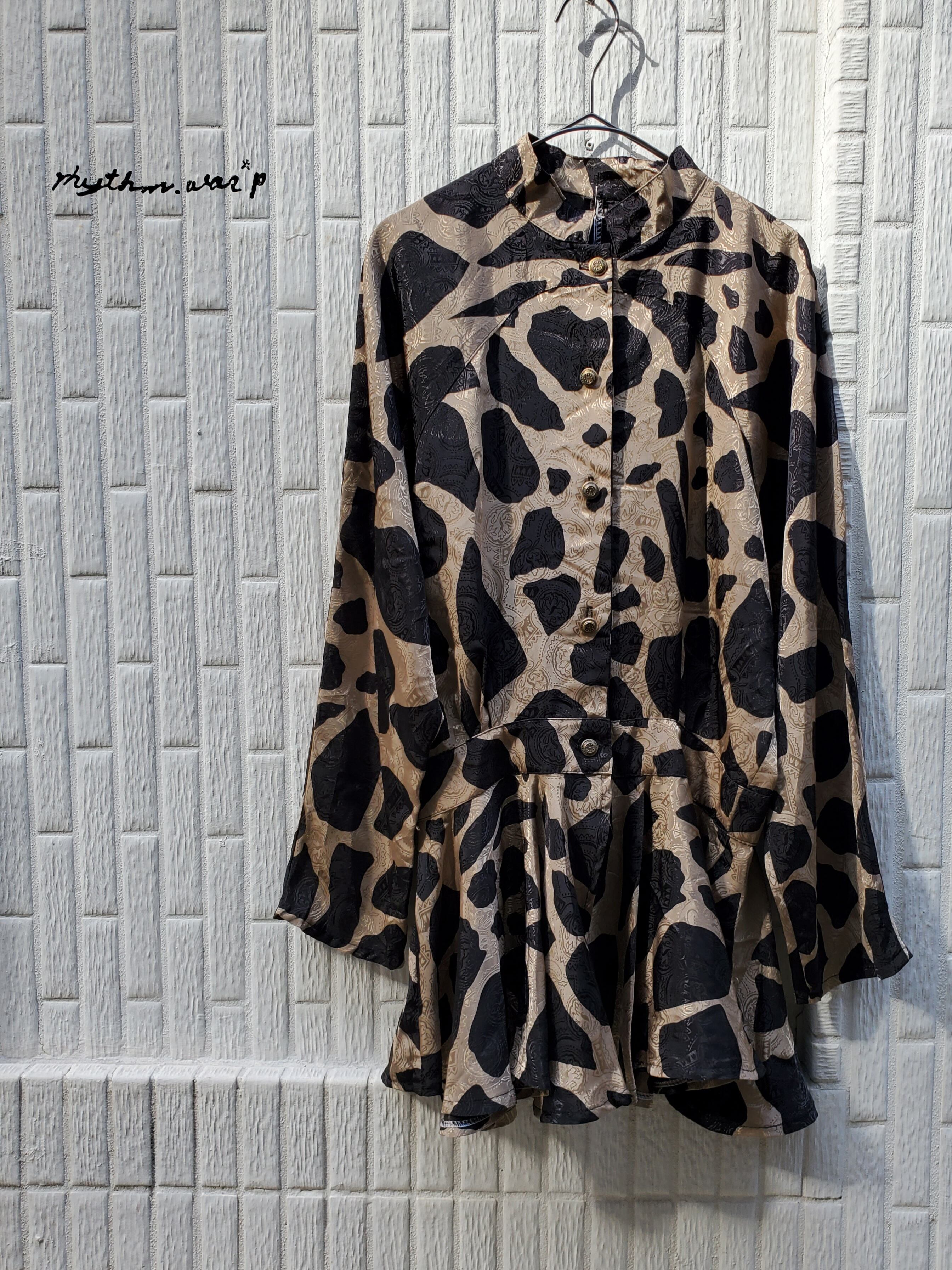 Made in Franceレオパード柄ペプラムブラウス。ウエスト85㎝とゆとりのある切り返しです。生地に織り込まれた柄もポイント。冬はニットをイン、夏は羽織に、オールシーズン着られるアイテムです。