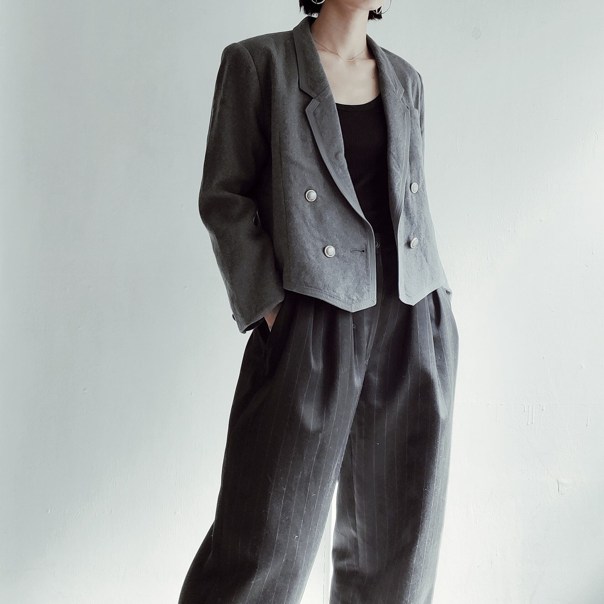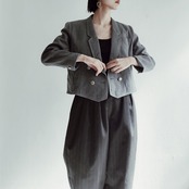 グレーのウールショートジャケット。日本製11サイズ、コンパクトなサイズ感です。グレイのワントーンでクロップド丈が魅力です。