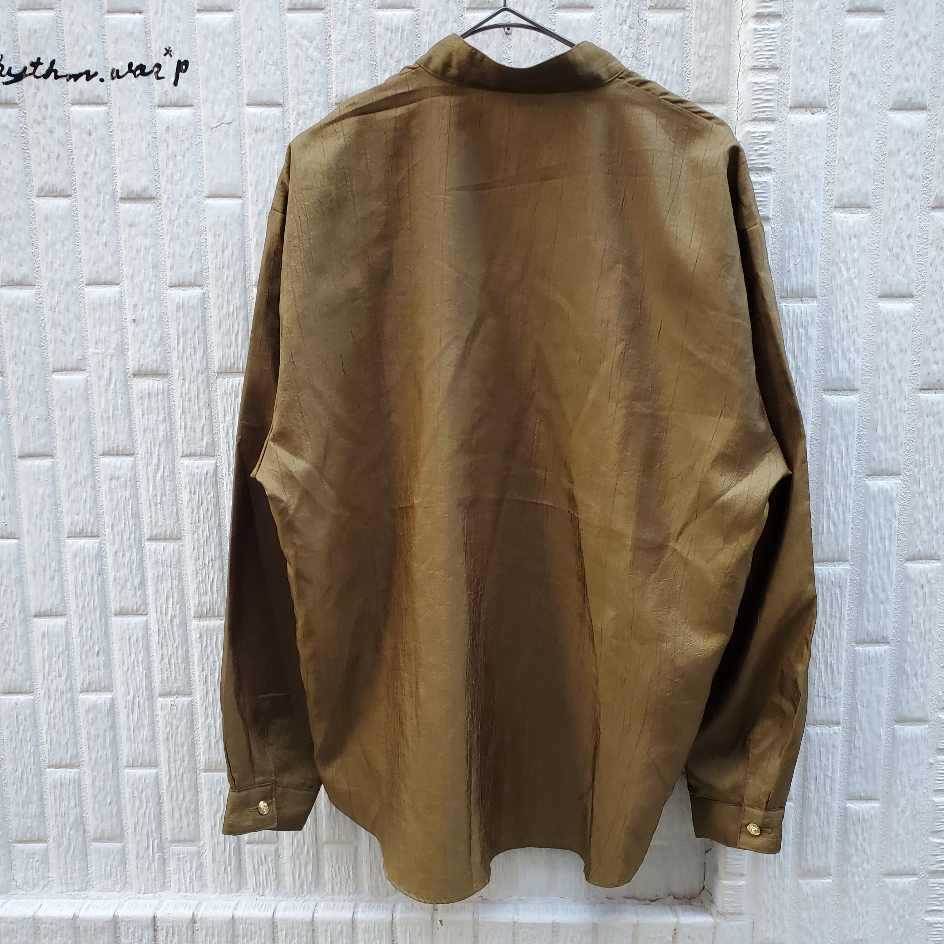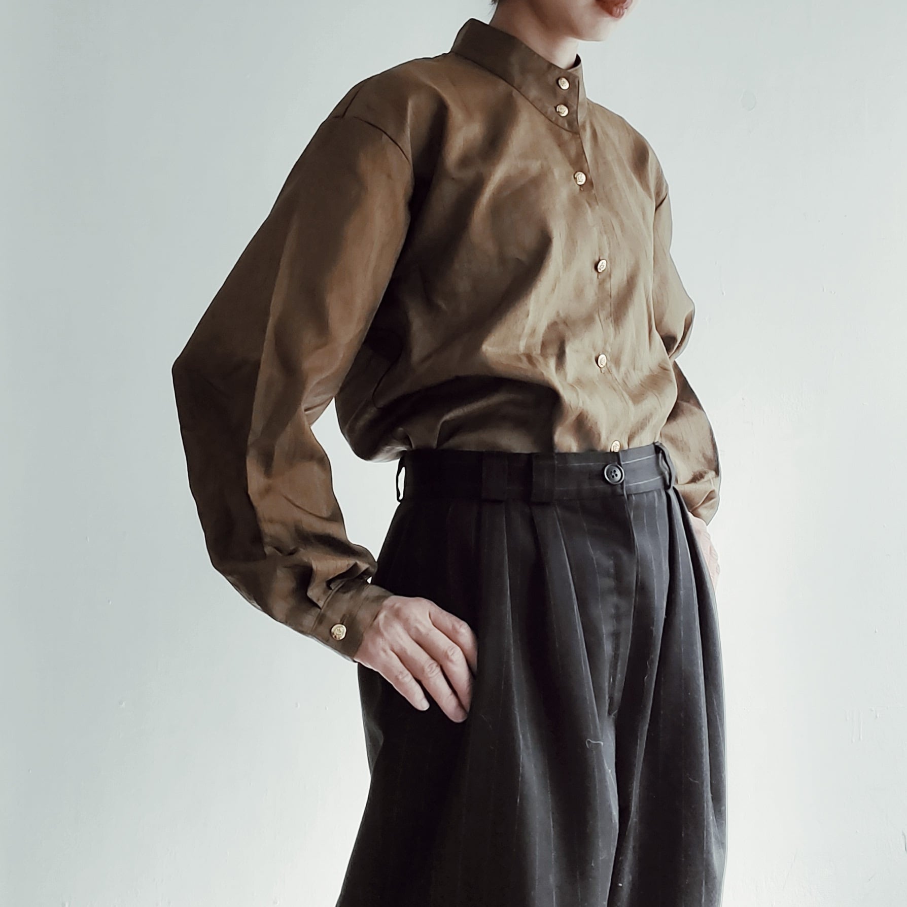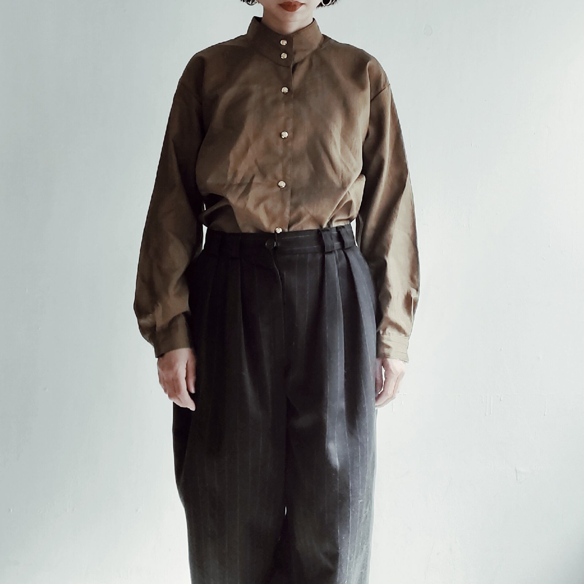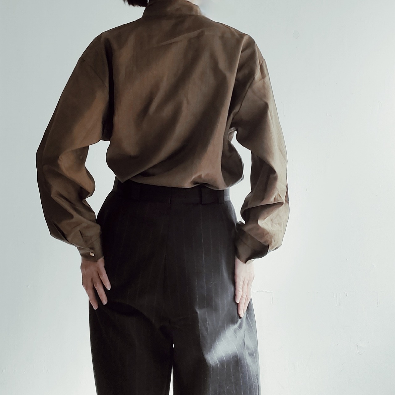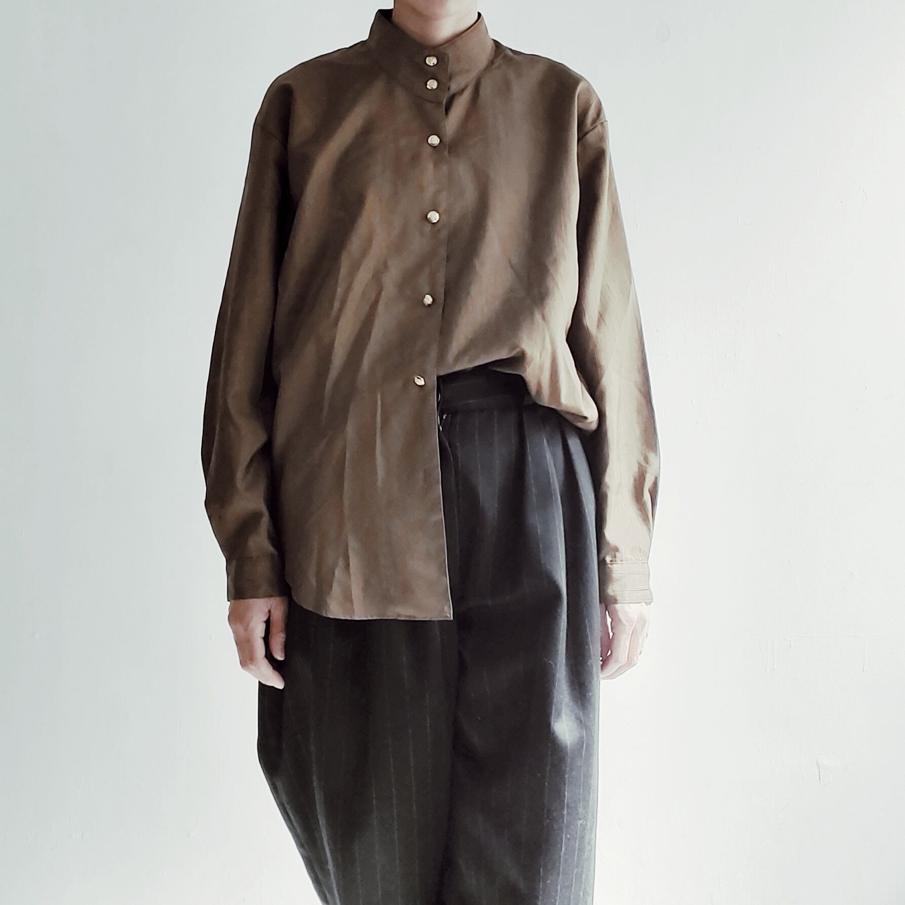 ノーカラーのハイネック。少し光沢があるオリーブ色のブラウスです。
