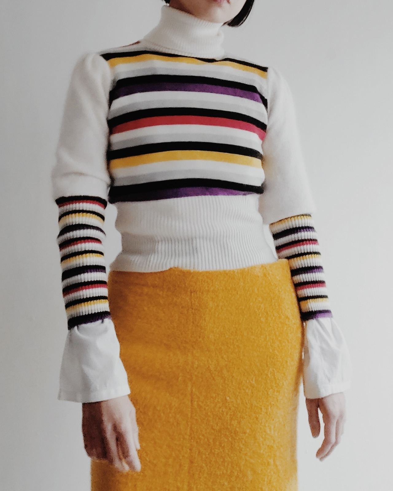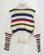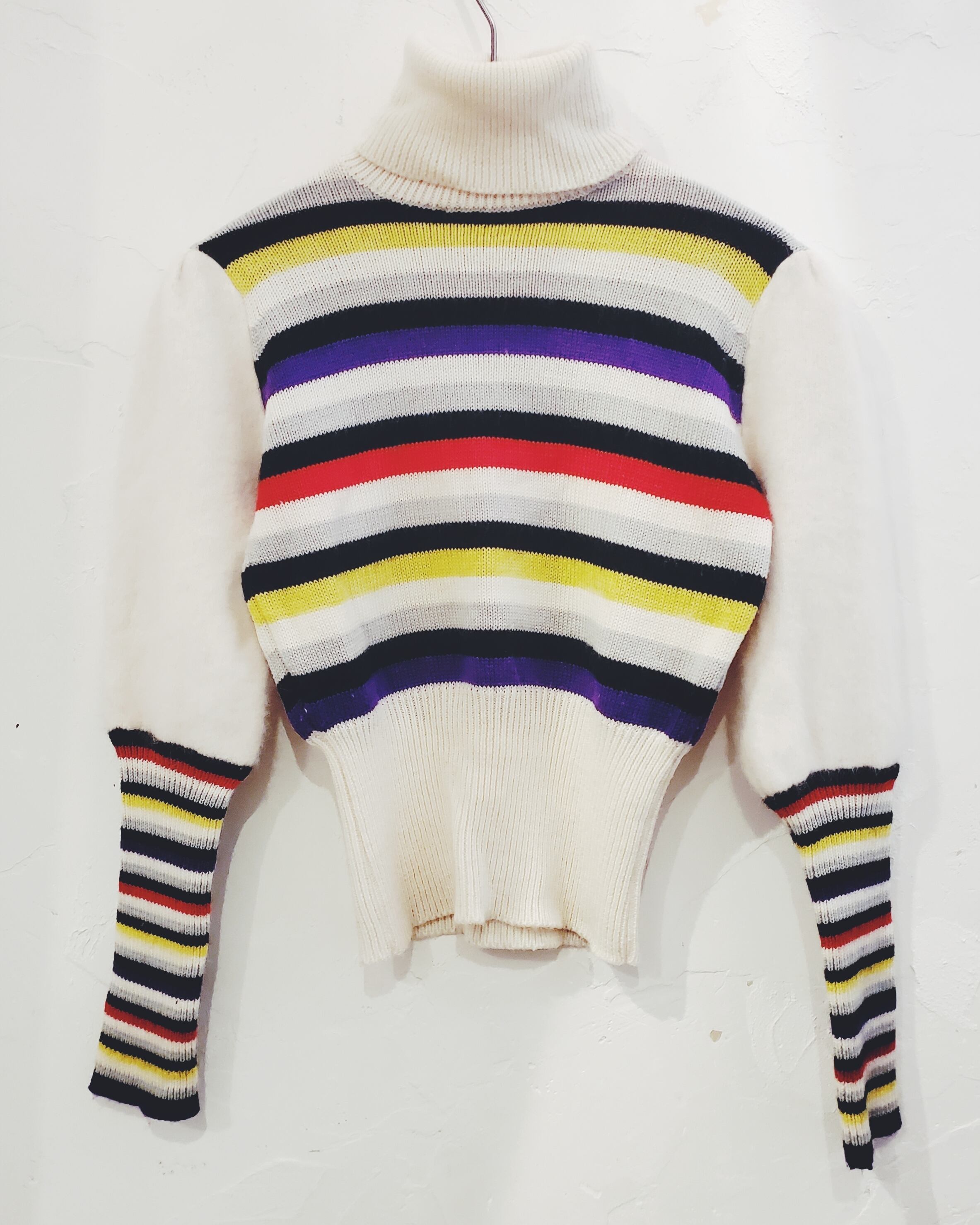 XSくらいのコンパクトサイズのハイネックセーターです。モヘアのパフスリーブとカラフルなボーダーが魅力です。