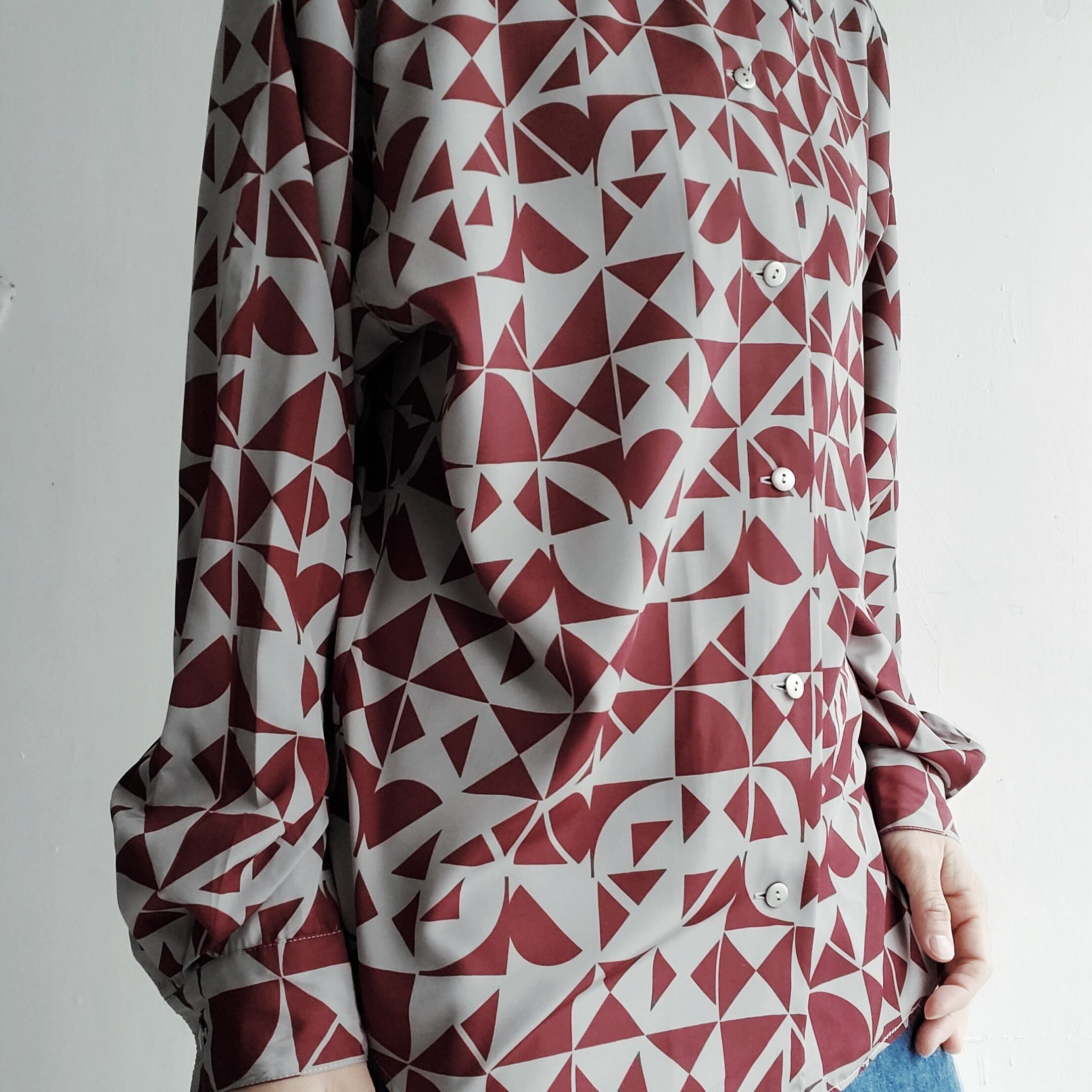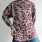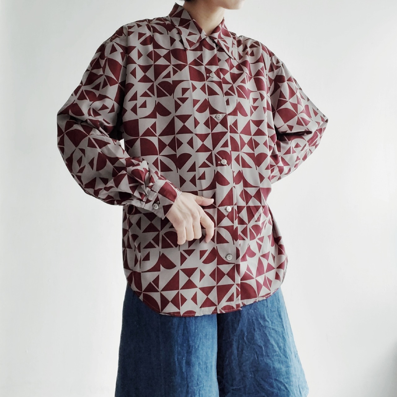 ジオメトリックな柄が可愛い女性用のブラウス。ポリエステル100%でさらっと肌心地良く着られます。