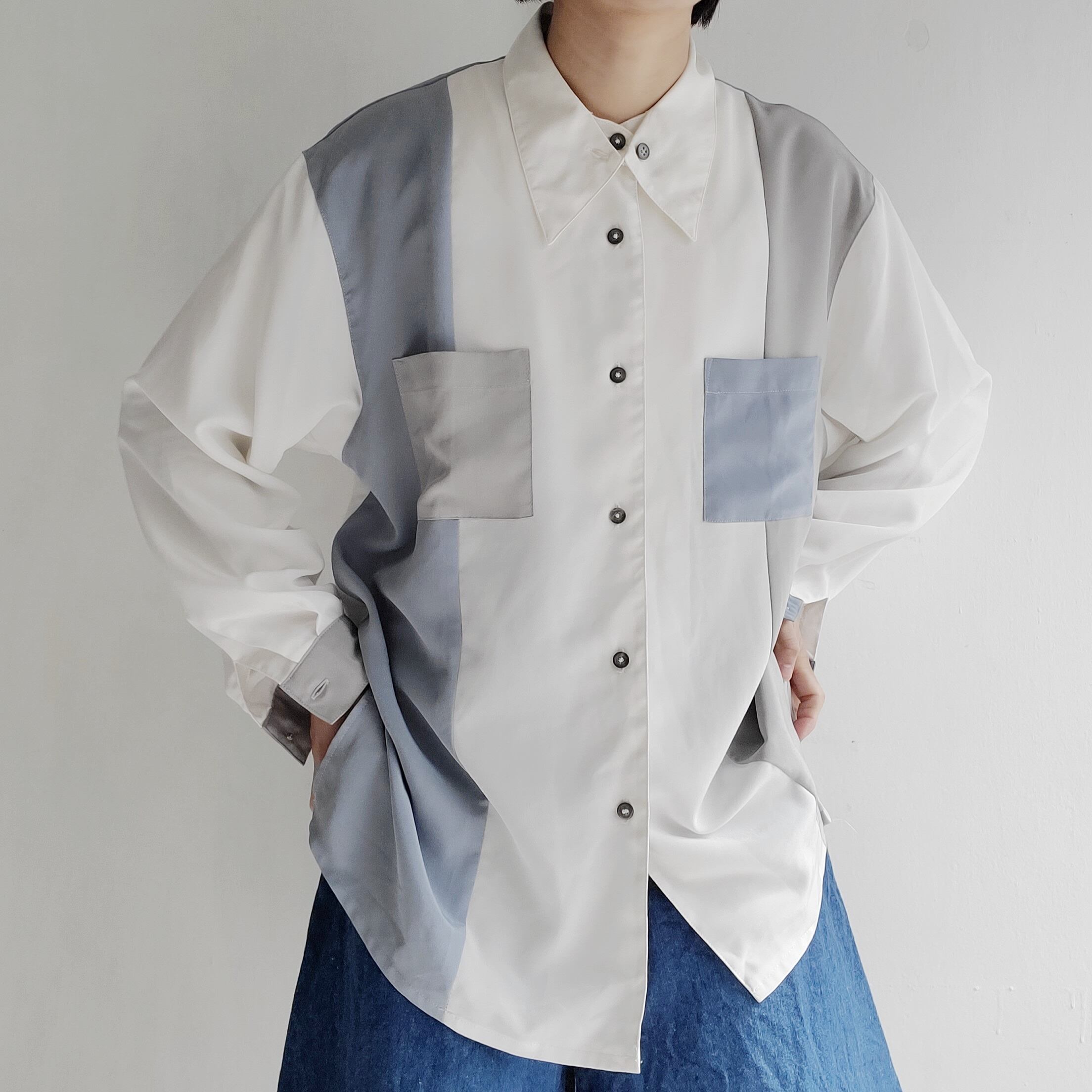 白、グレー、ブルーグレーの3色で構成されたレディースブラウス。袖やポケットの色に違いがあってとてもかわいいです。襟のボタンも面白いデザインになっています(画像参照)。