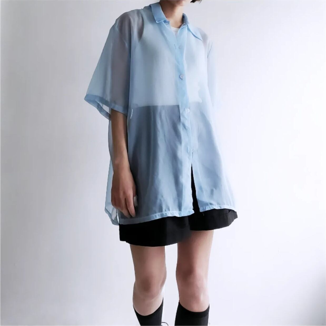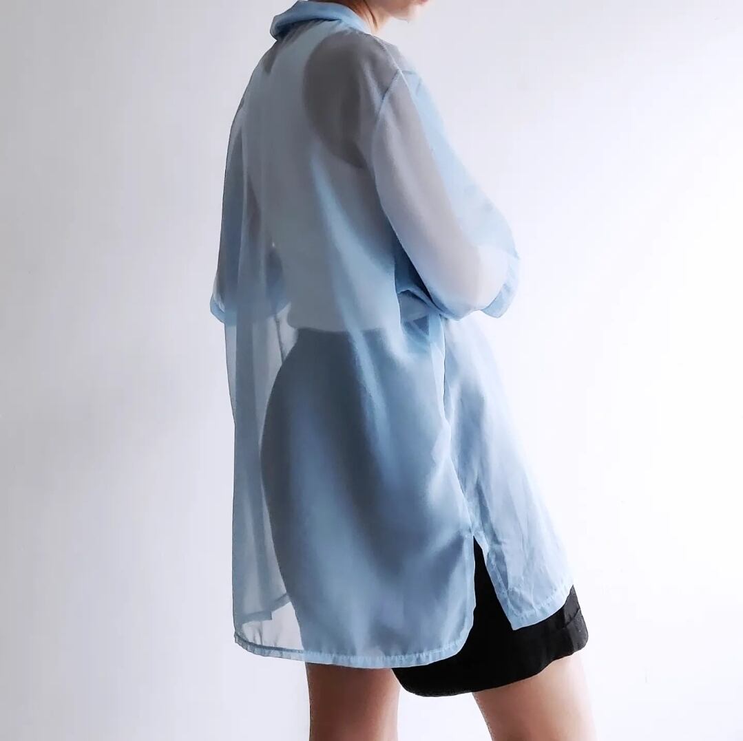 水色のシアーシャツ。シャツONシャツ,TシャツONシャツなど様々なアイテムとのレイヤードコーデを楽しめます。