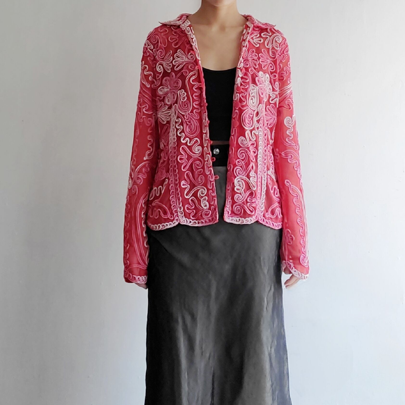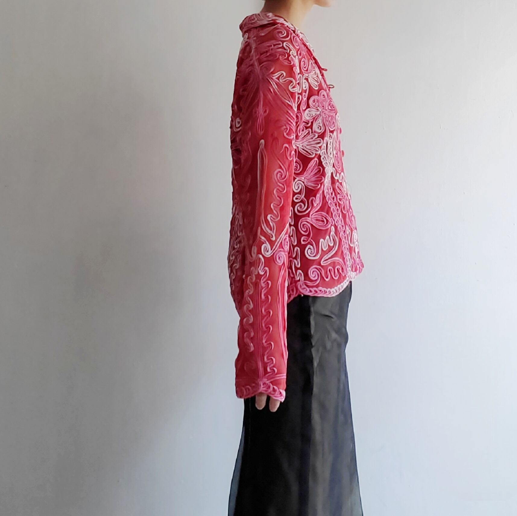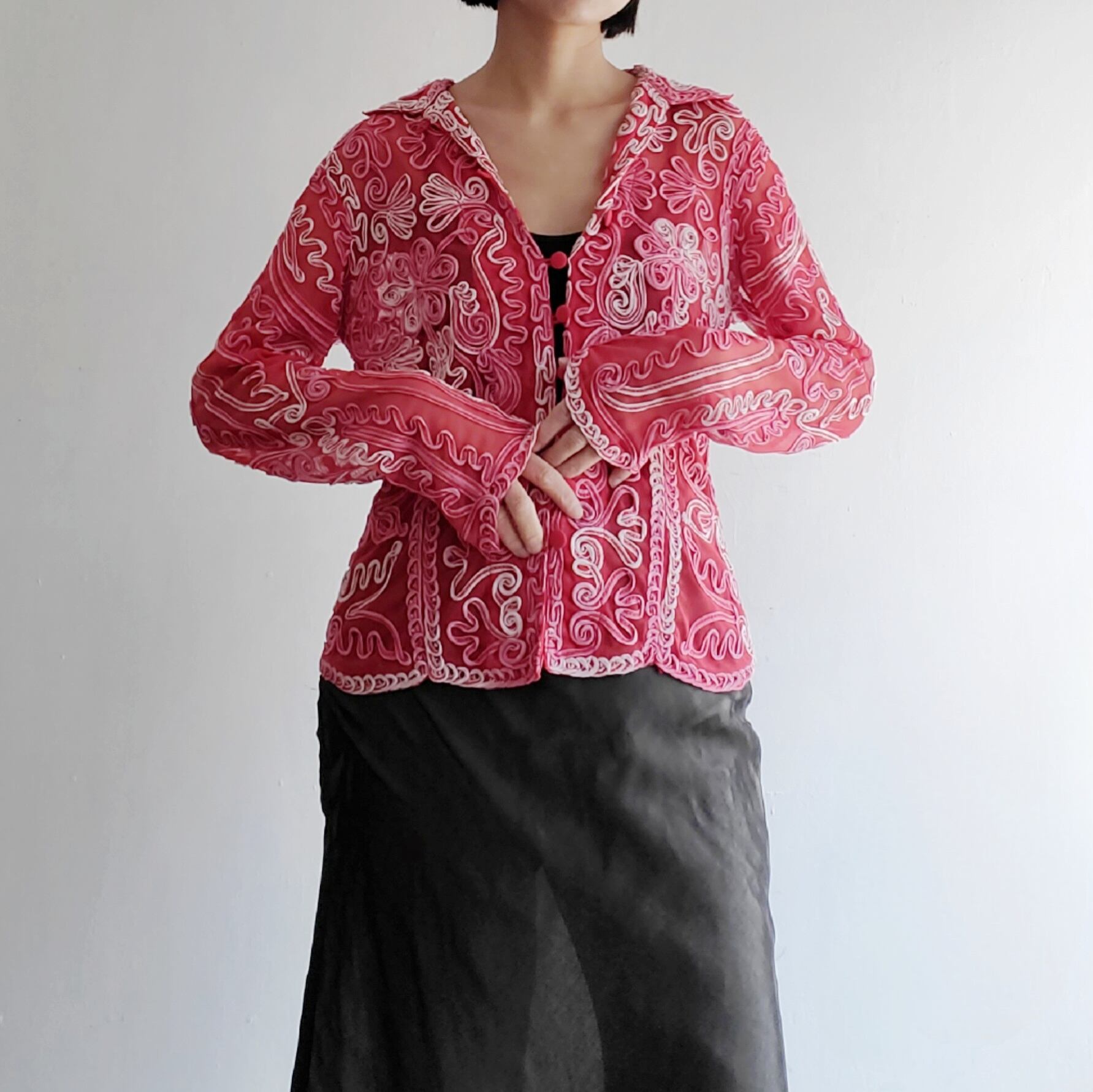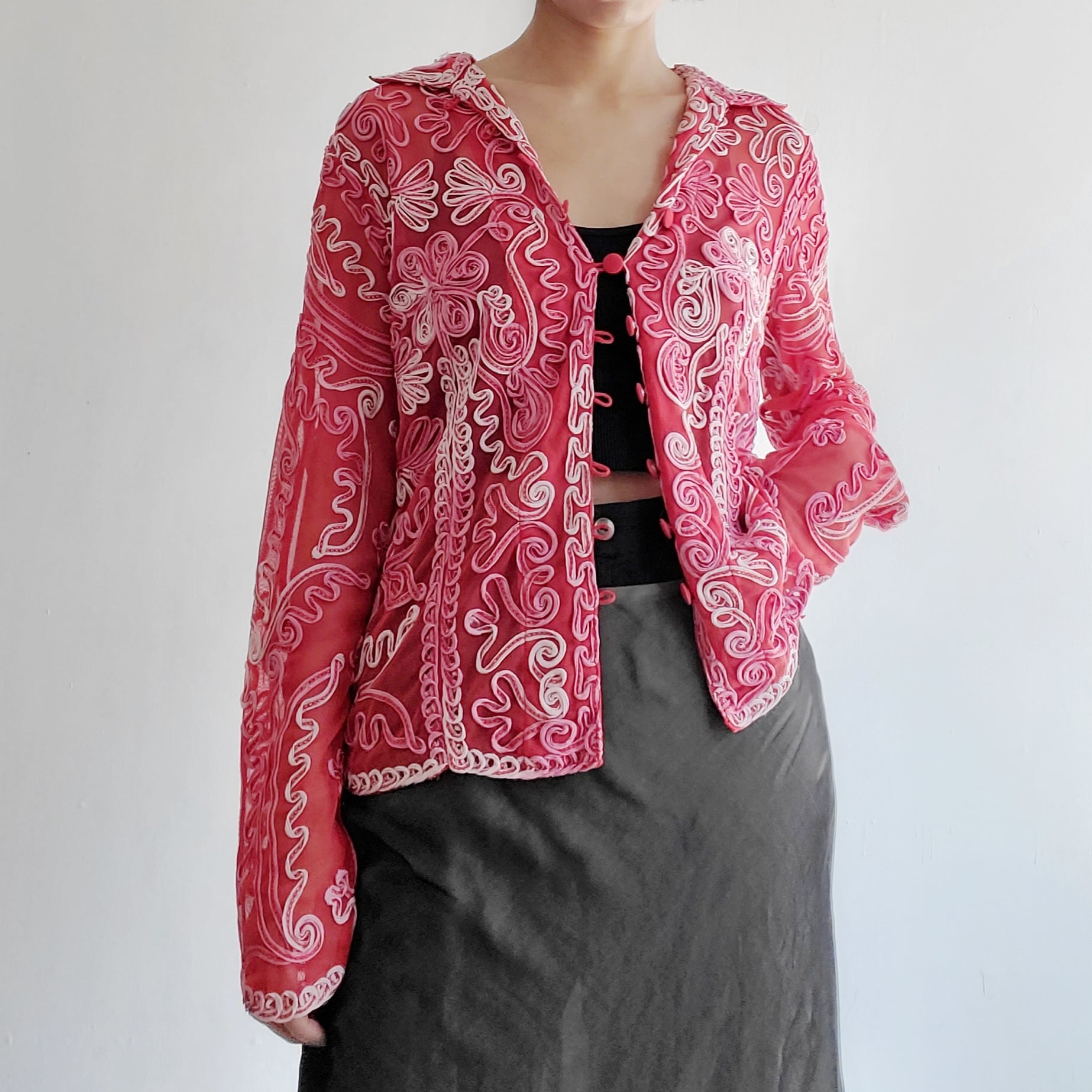 コード刺繍のシースルーメッシュジャケット。ベースカラーは赤ですがコードはピンク~白のグラデーションになって花柄が描かれています。オールシーズン様々なコーデに活用できるアイテムです。