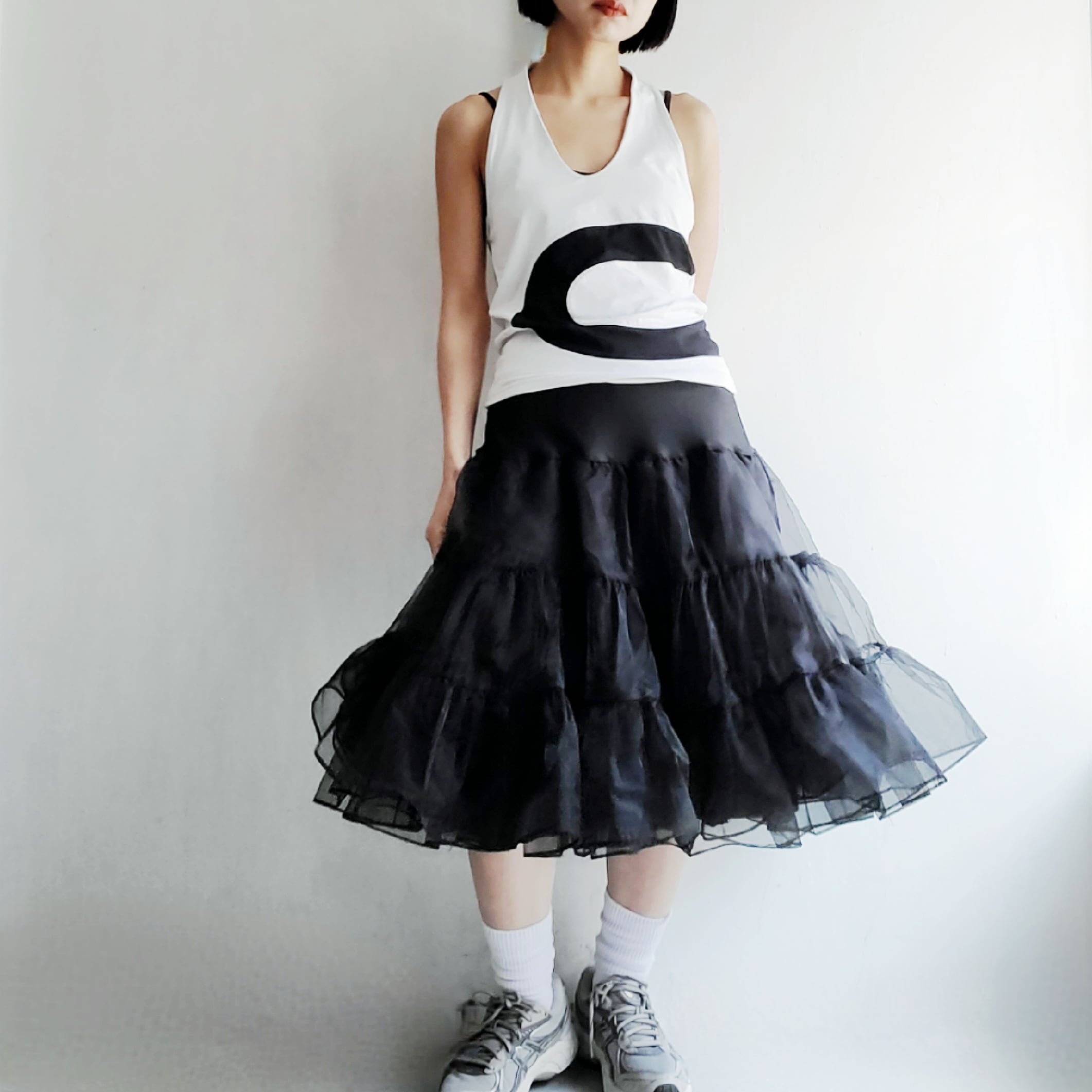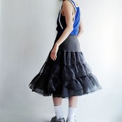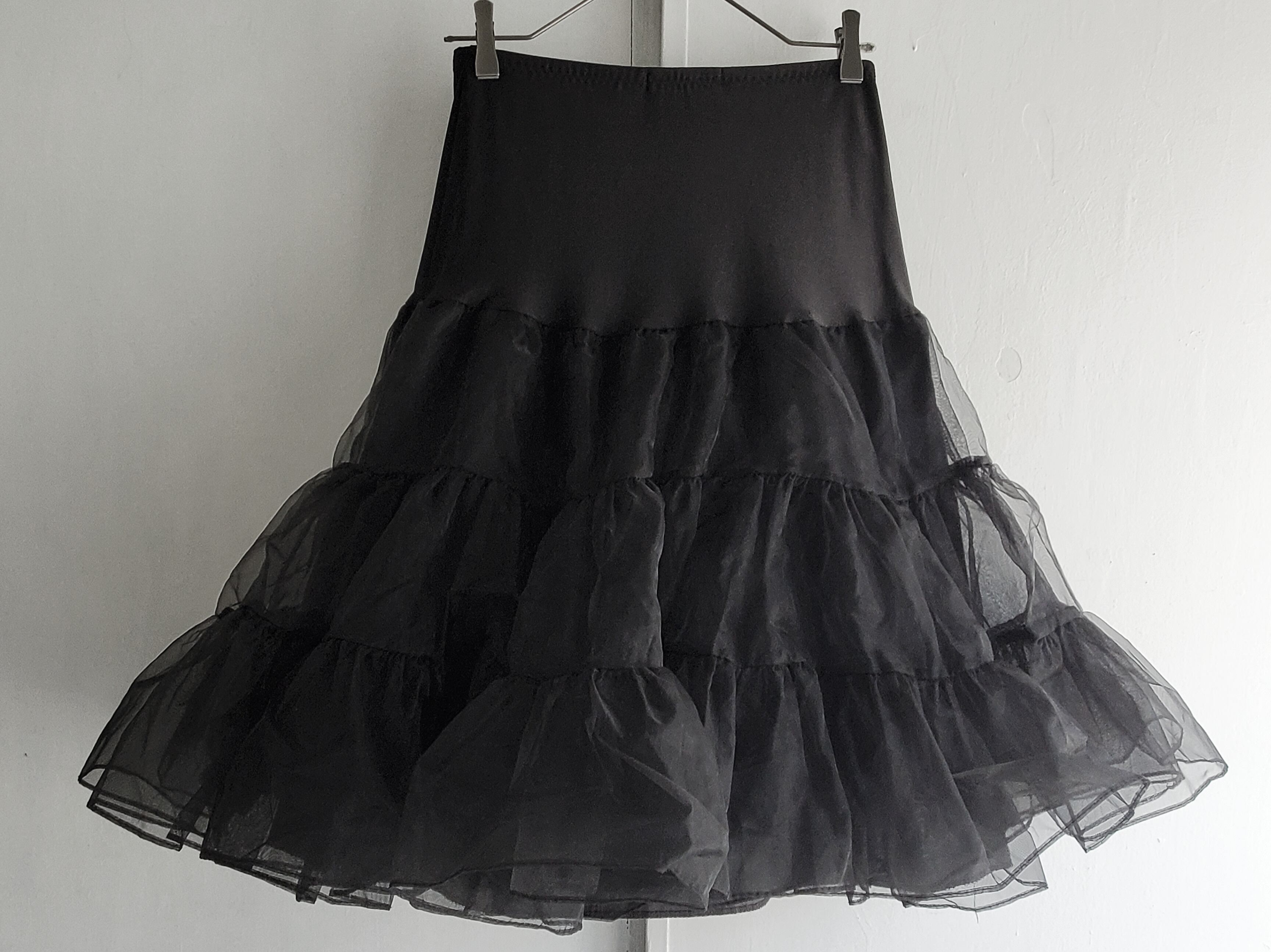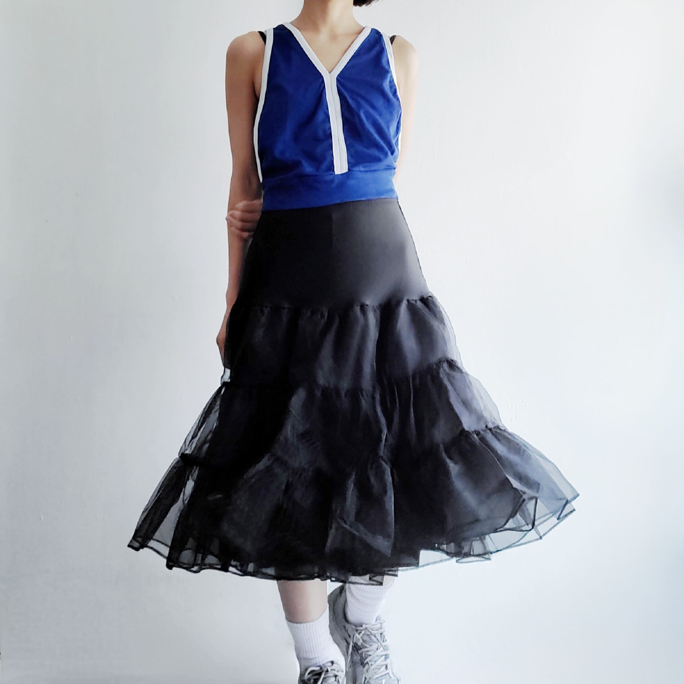ヒップラインからチュールが入ったボリュームパニエ。チュールは2枚+ライナーでボリューム満点。ウエストからヒップまではジャージー素材で伸縮性があります。スカートのボリューム出すのにはもちろんそのままでも。デニム重ねも◎