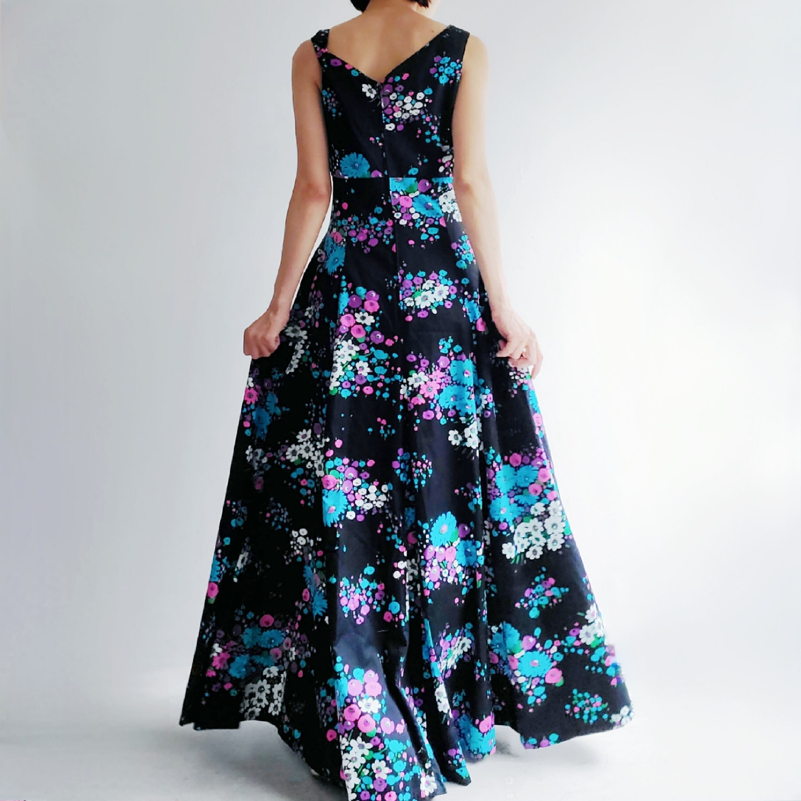 オランダより入荷したロングワンピース。バスト下で切り替えがありシルエットがキレイです。黒地にカラフルなフローラル柄が夏にぴったりです。