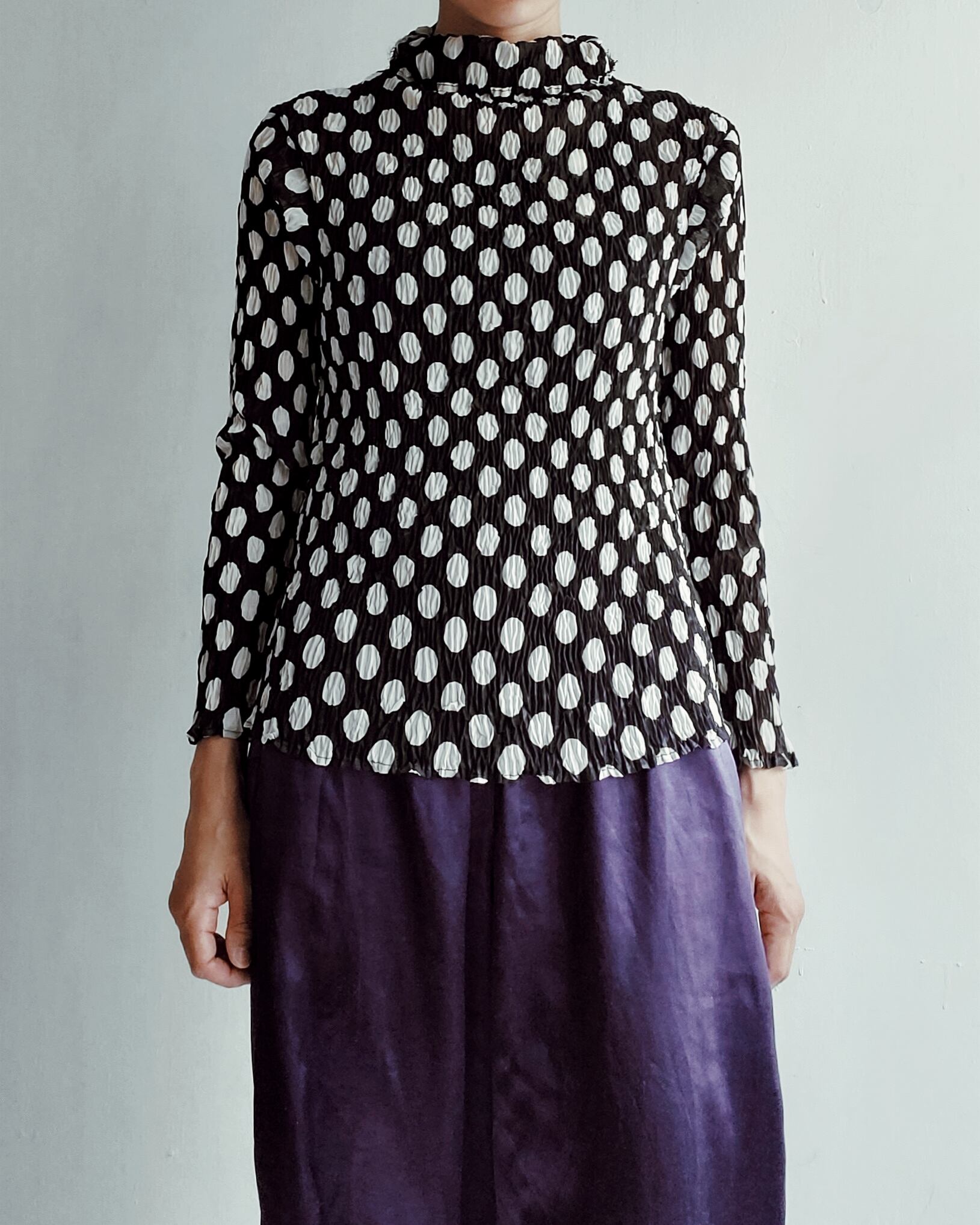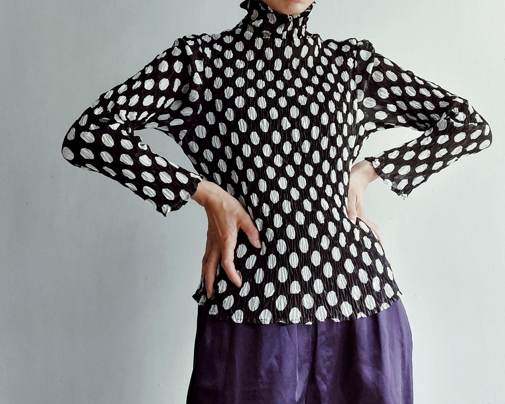 透け感のあるハイネックシアーカットソー。横に伸縮性があるのでフリーサイズでお楽しみいただけます。大きめのドットが可愛いです。