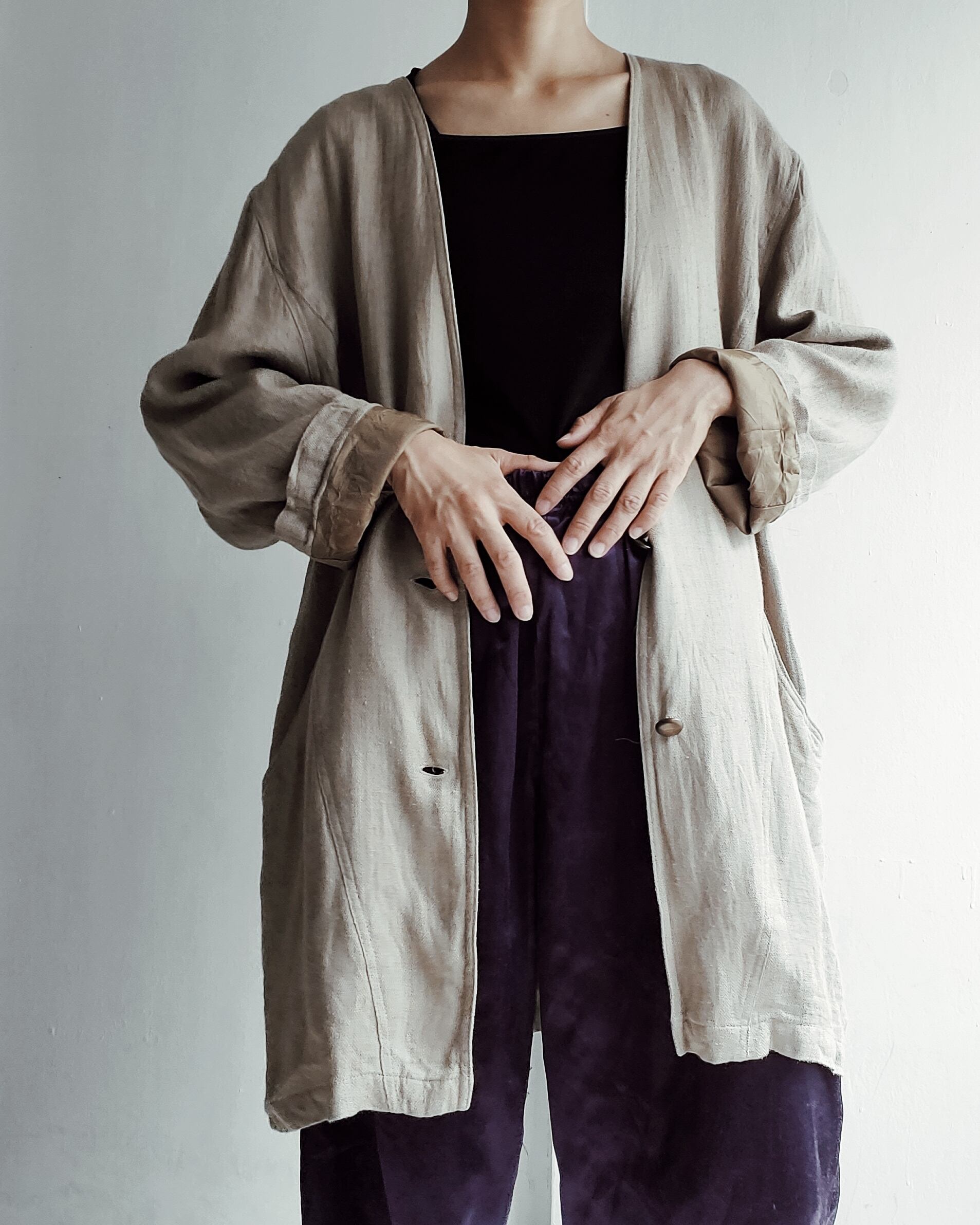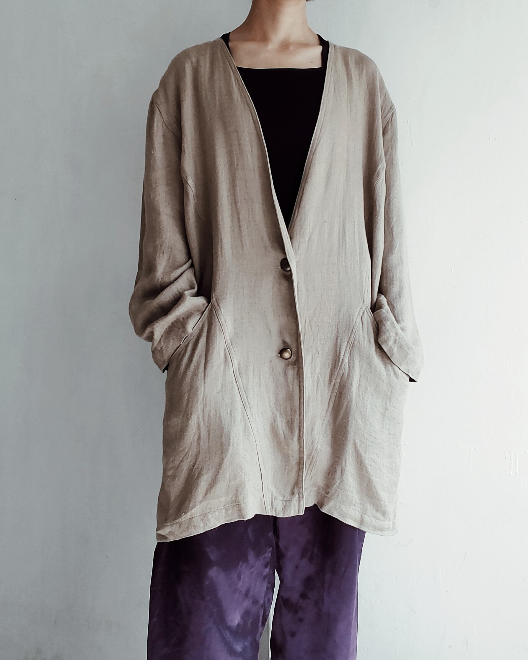 フィンランド製のリネンガウンジャケット。落ち着いたカーキ色で緩く羽織れるのが◎すこし使用感があるのも良い味です。