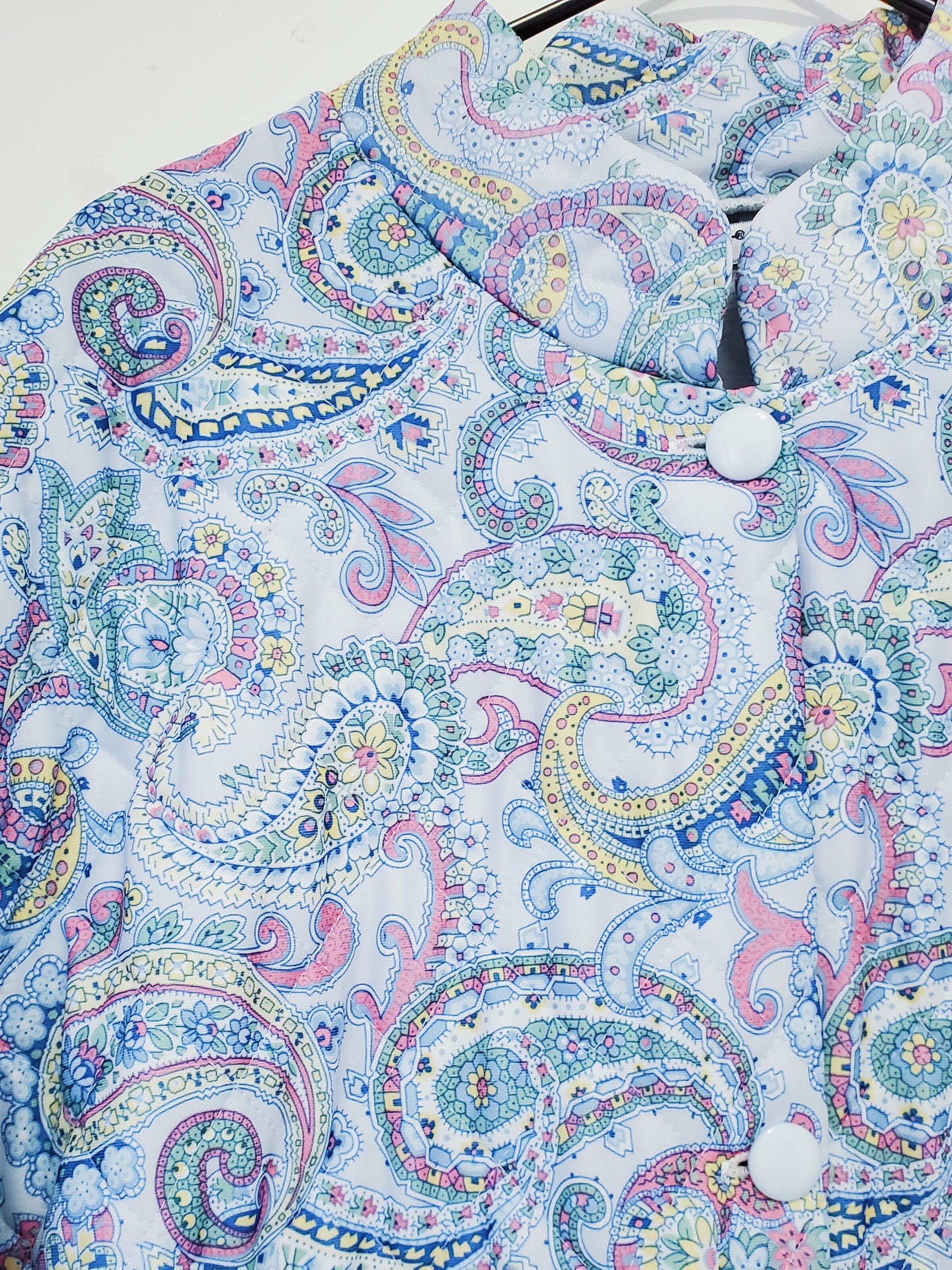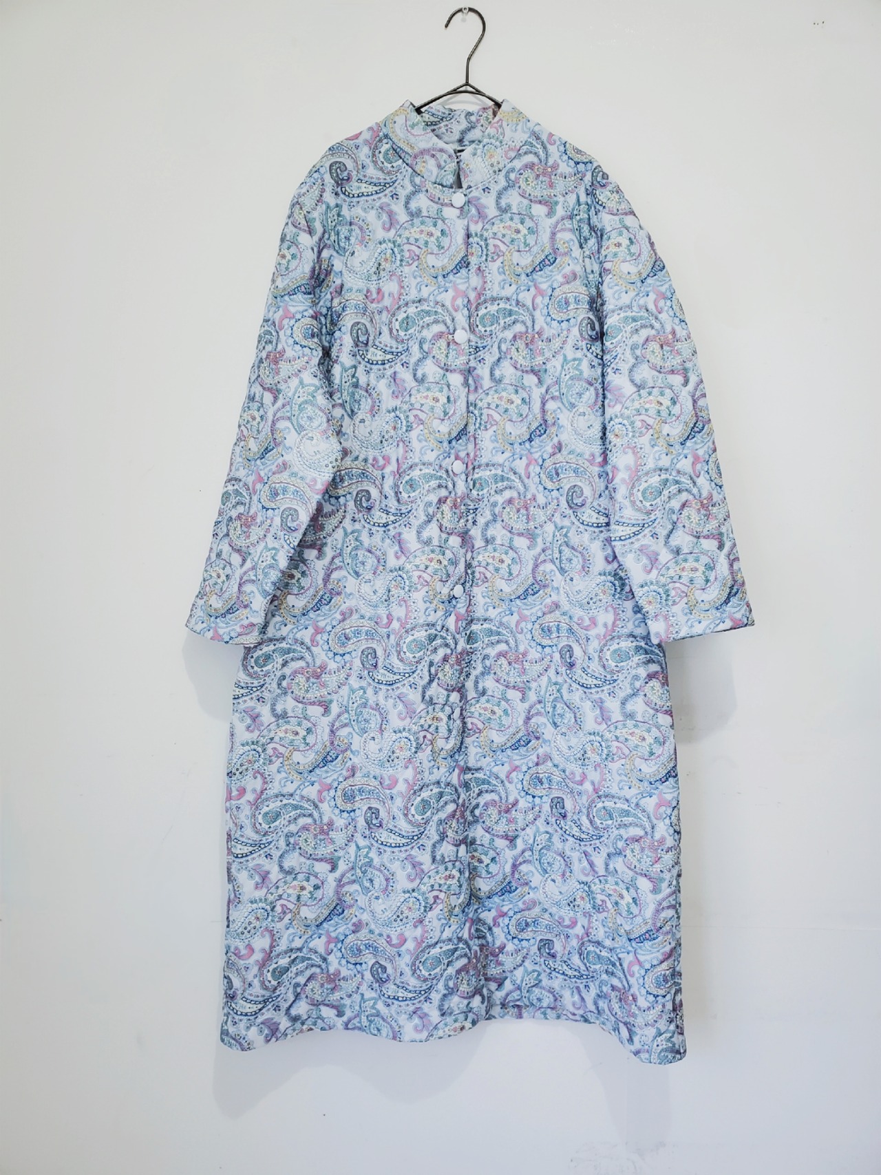 フランスのインナーウェアブランドDAMARTによるキルティングペイズリーコートです。軽やかなキルティング素材と、淡いパステルカラーで描かれたペイズリー柄が特徴的な一着。暖かさと快適さを兼ね備えたデザインで、寒い季節でもコーディネートに華を添えます。