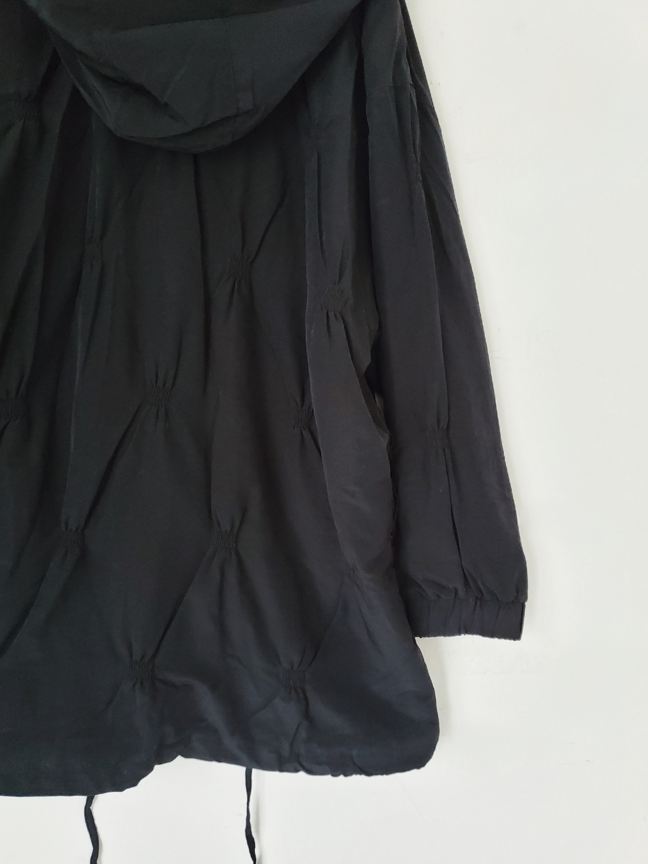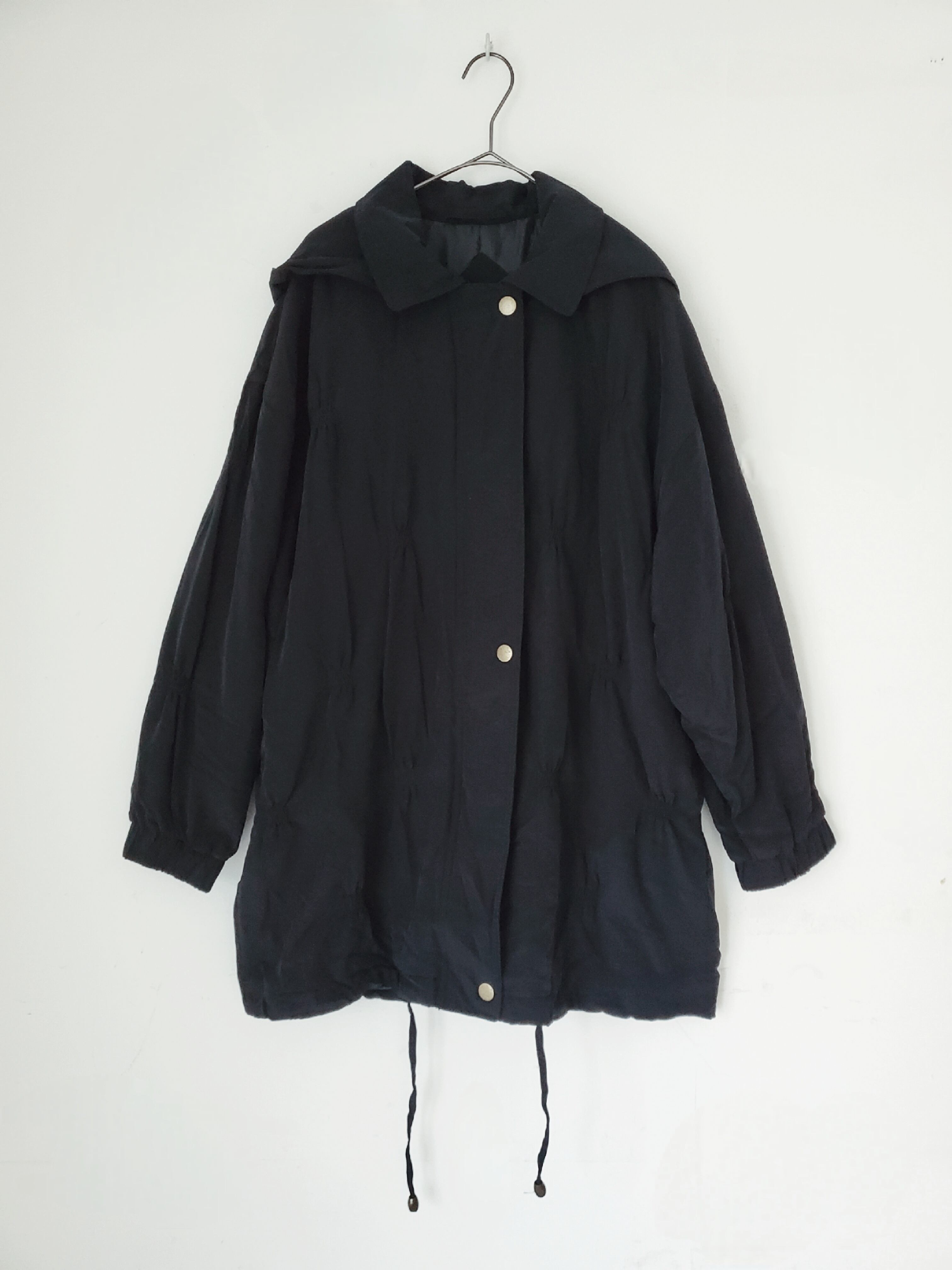GATHERED BLACK COAT WITH REMOVABLE HOOD.