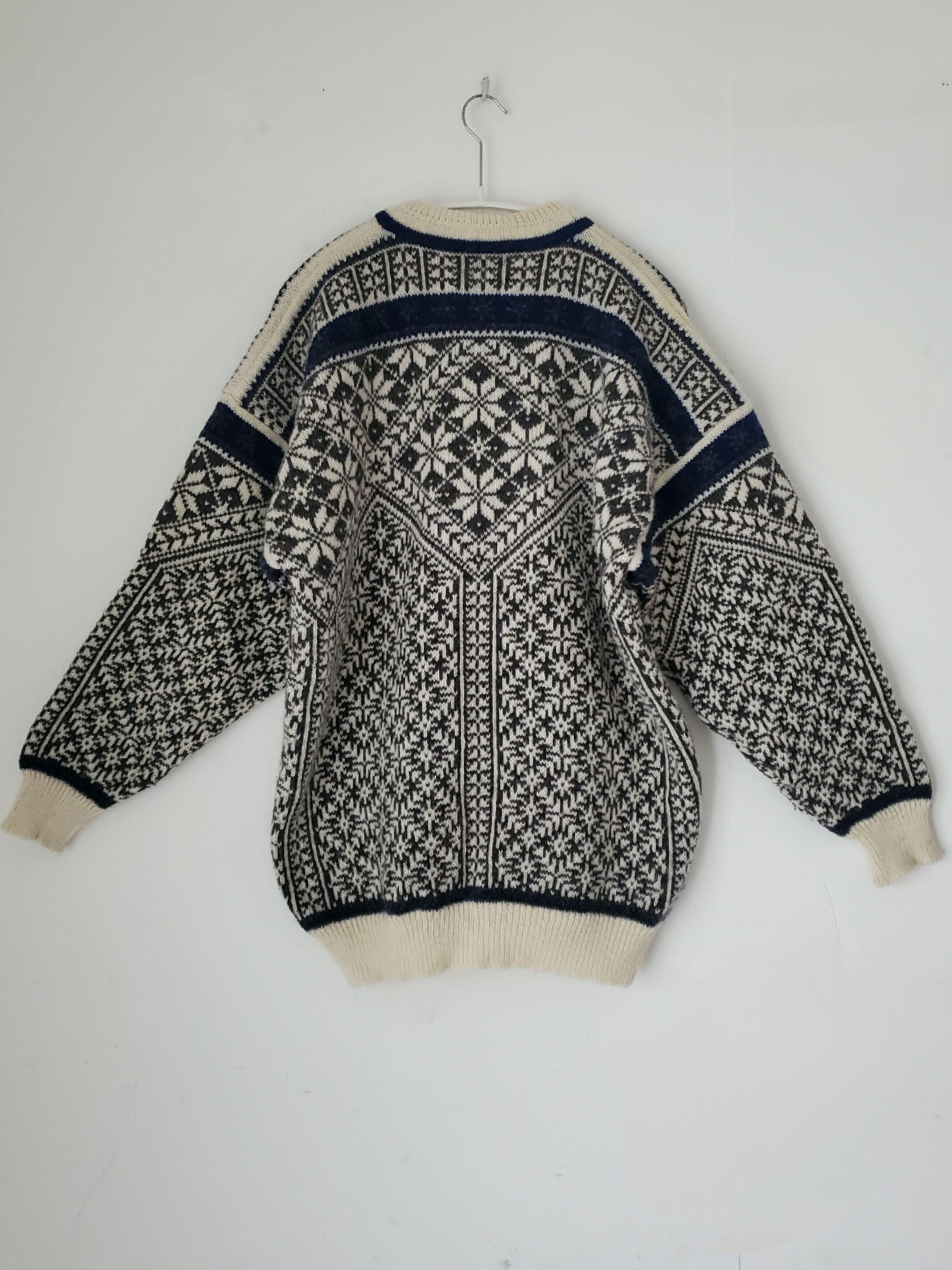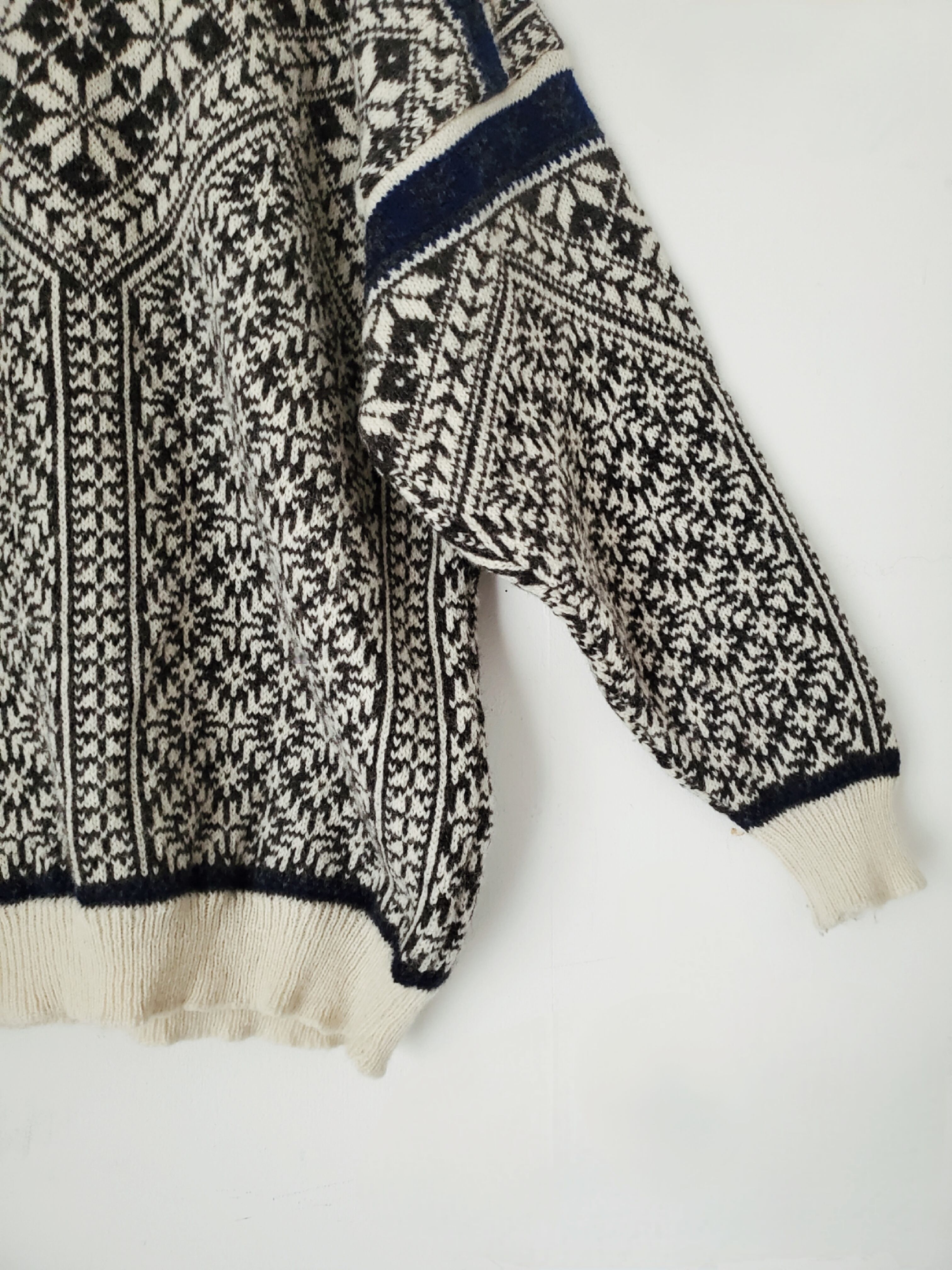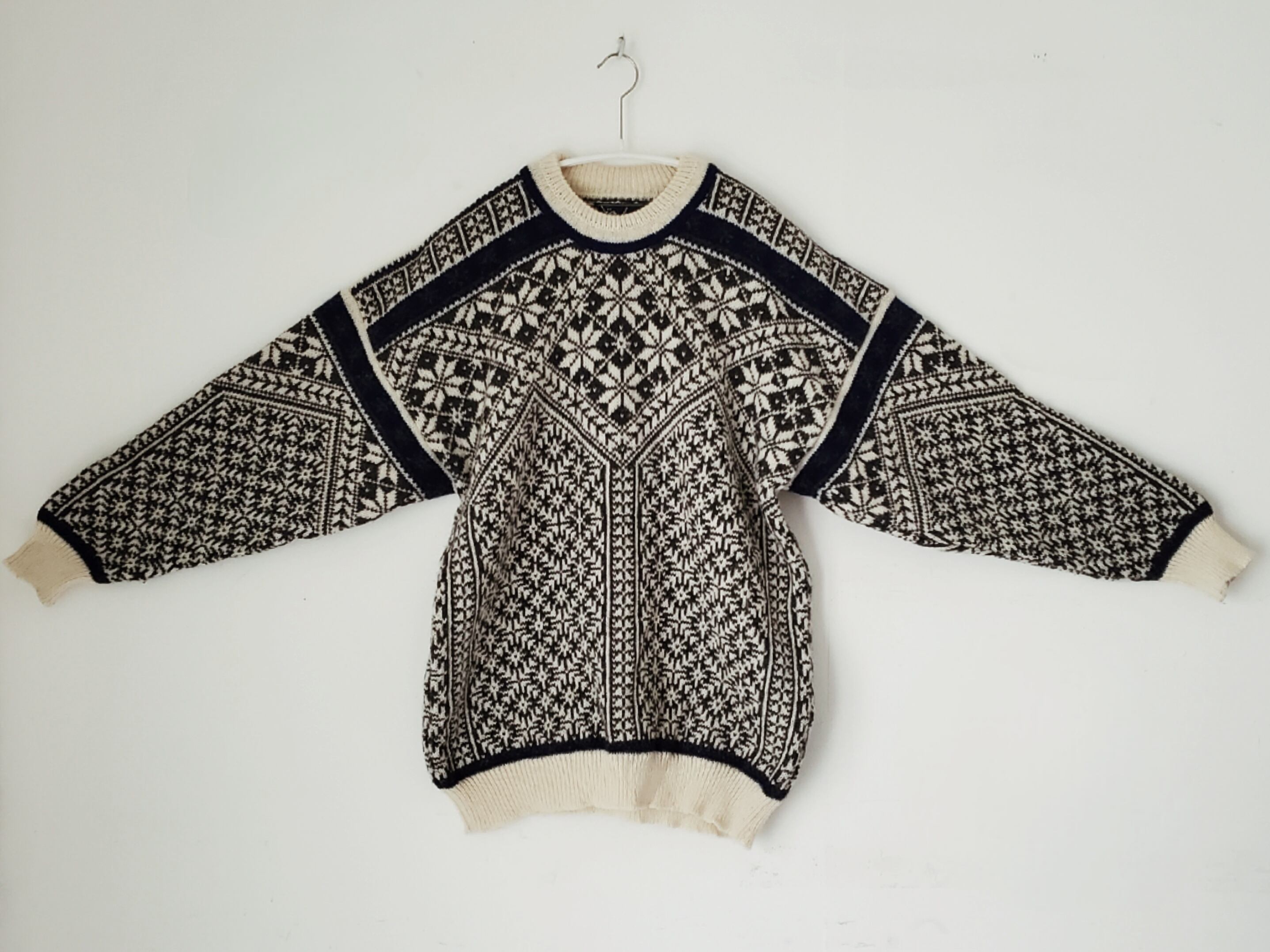 ノルウェー製のモックネックセーター。ノルディックデザインとゆったりシルエットが魅力で、ユニセックスに楽しめる一枚です。