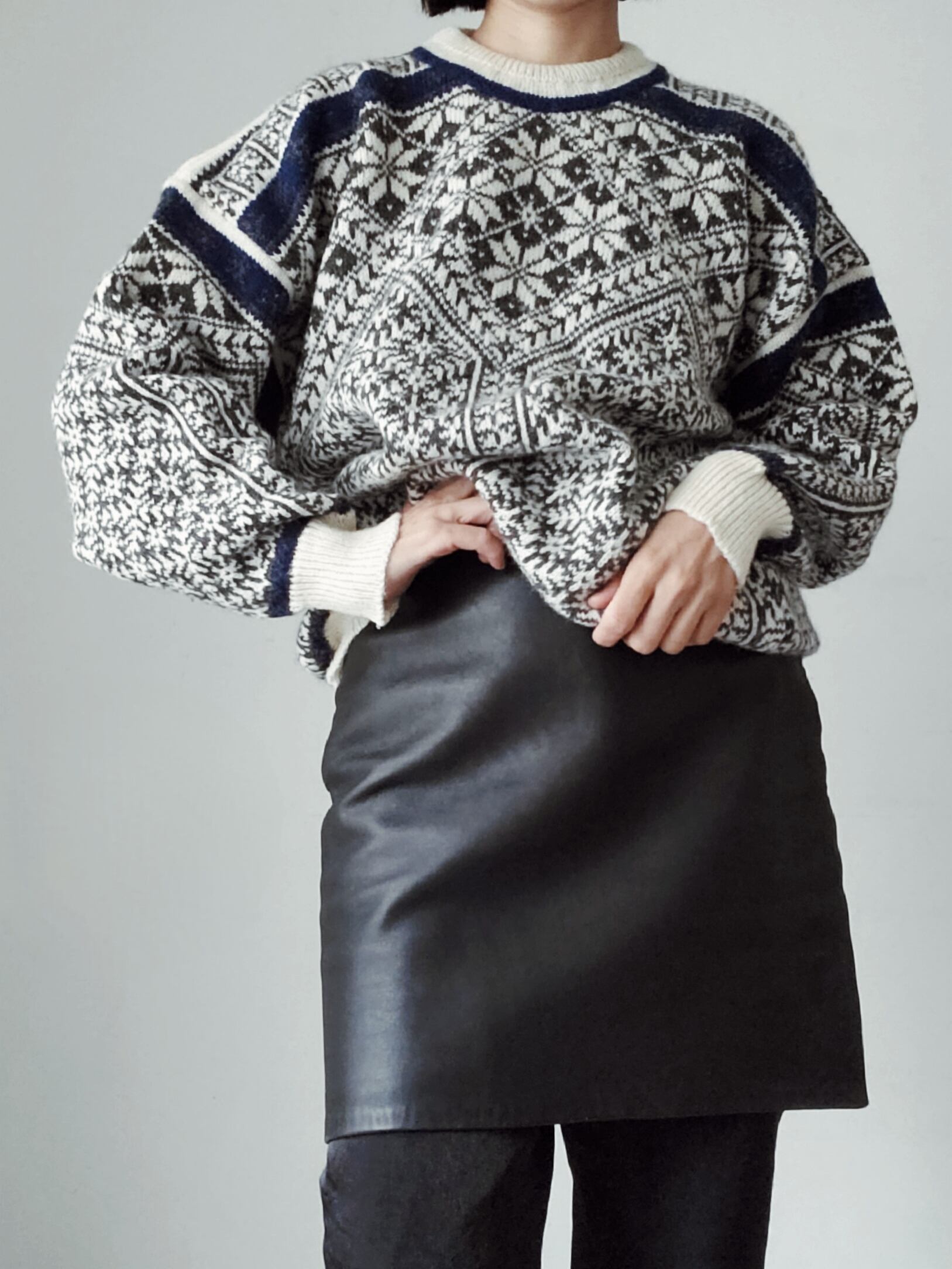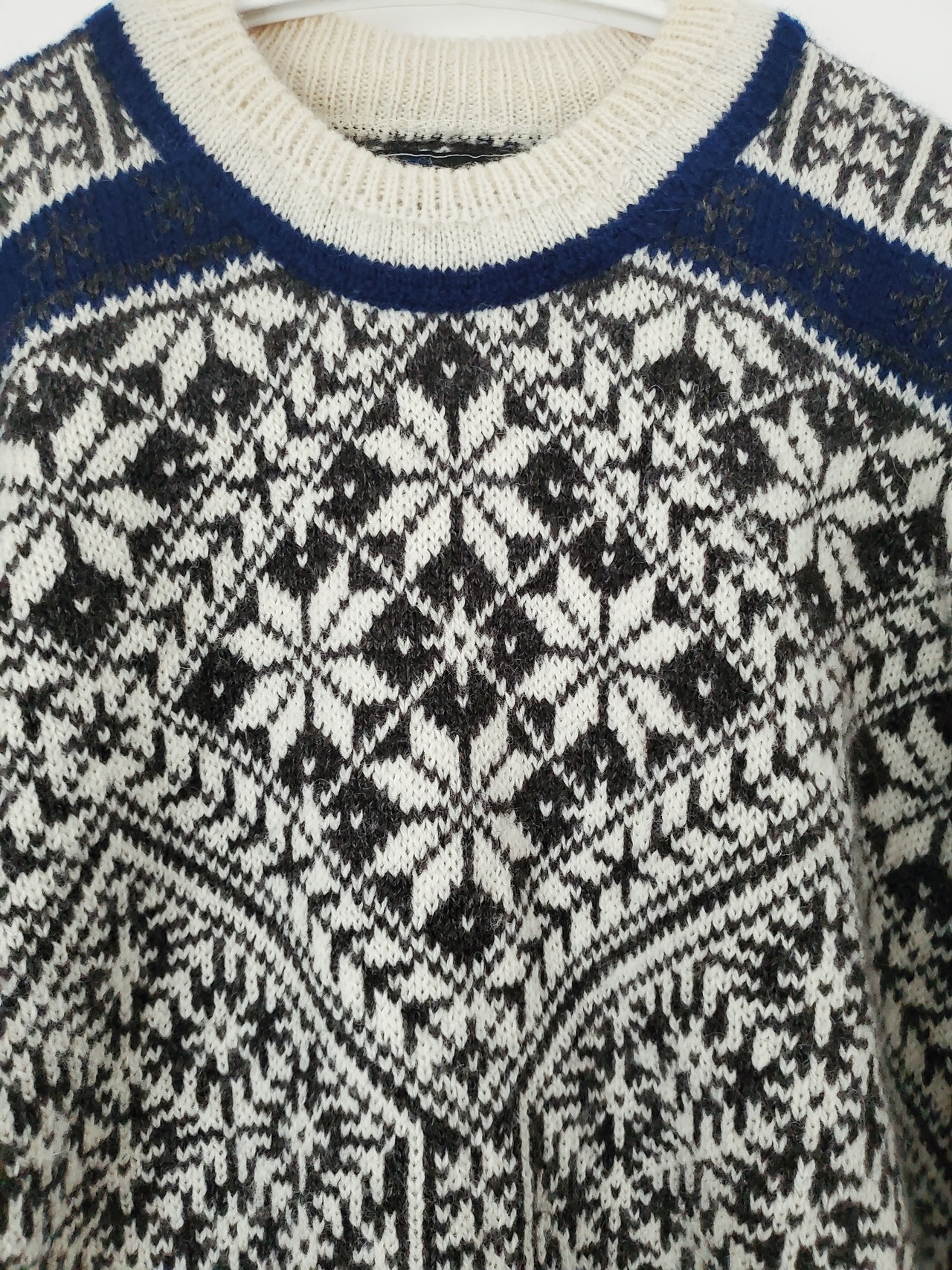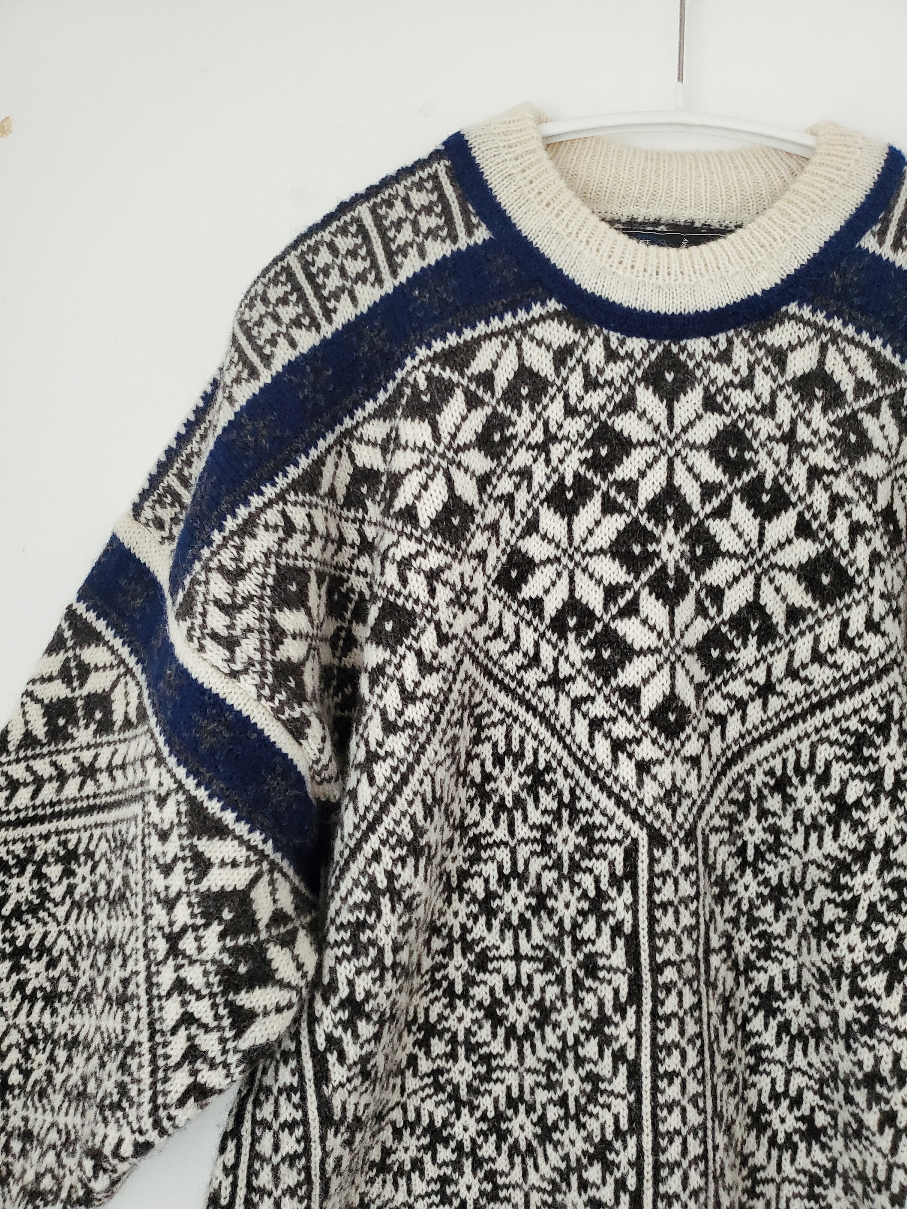 ノルウェー製のモックネックセーター。ノルディックデザインとゆったりシルエットが魅力で、ユニセックスに楽しめる一枚です。