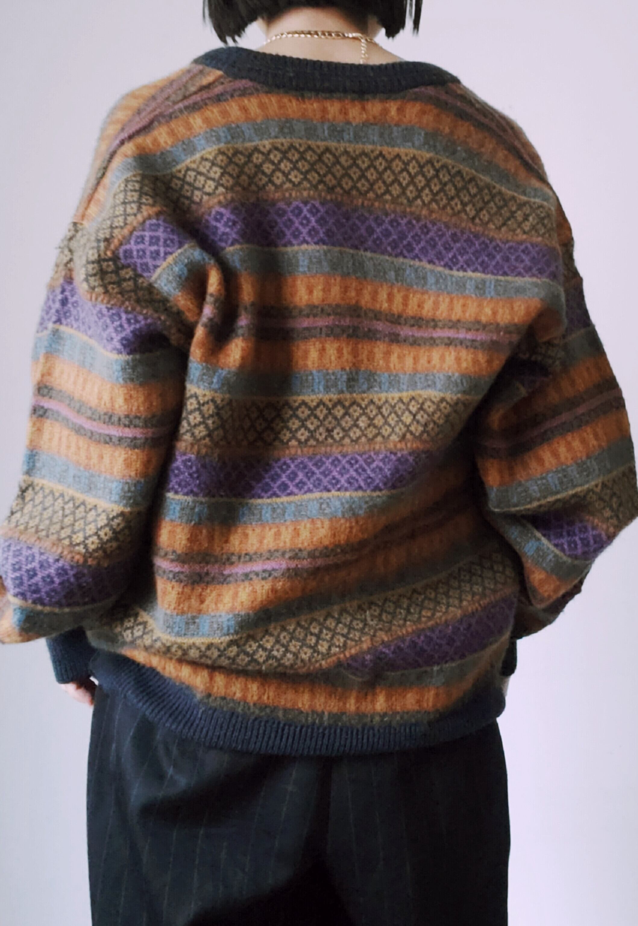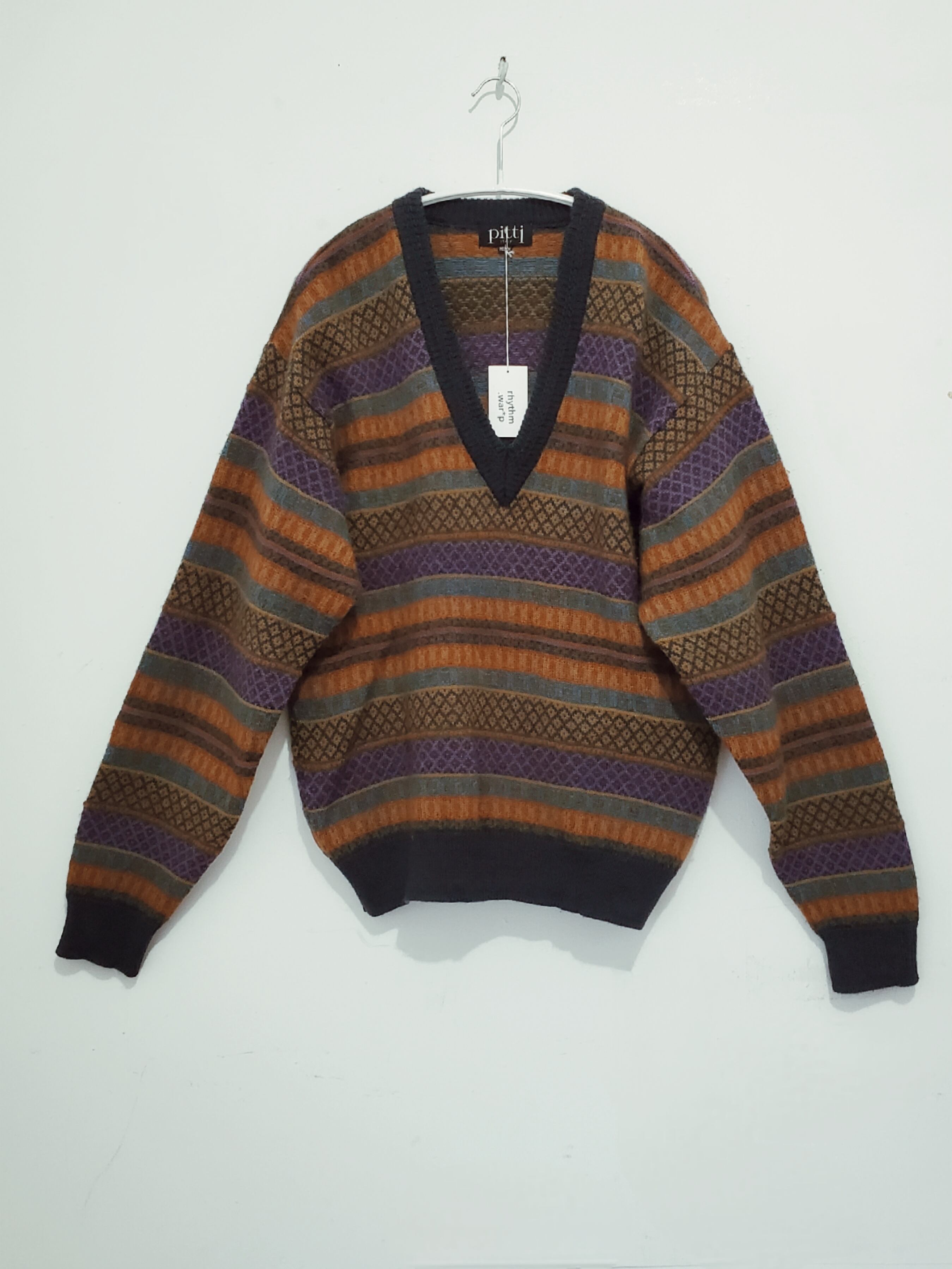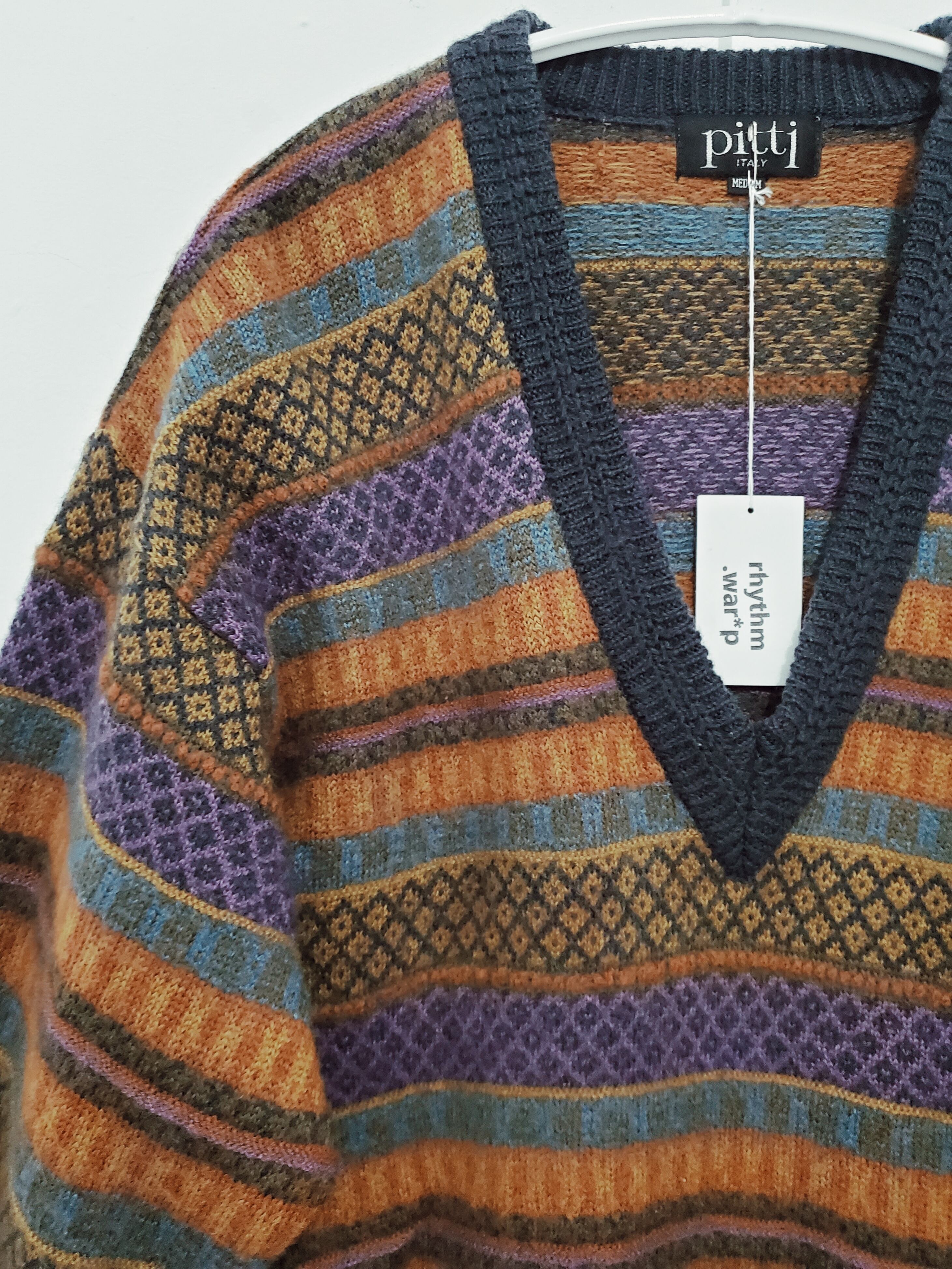 温かみのある配色と幾何学模様が印象的なニットトップス。深めのVネックが首元をすっきりみせ、重ね着にも最適です。腕に程よいボリュームがありながら身幅大きすぎないため全体的にもすっきりとした印象です。落ち着いたトーンのストライプ柄がカジュアルからシックなコーデまで幅広く活躍する一枚。