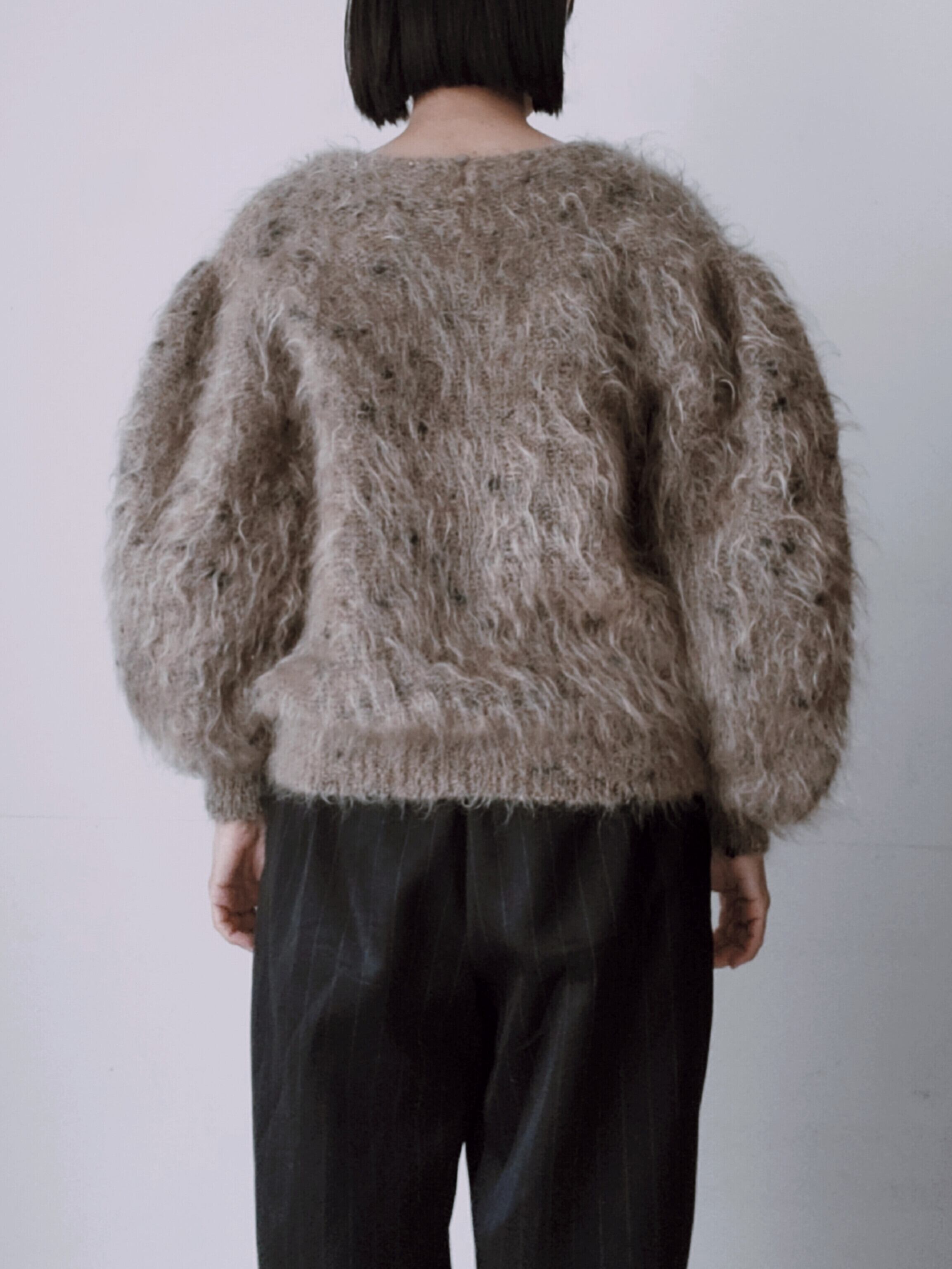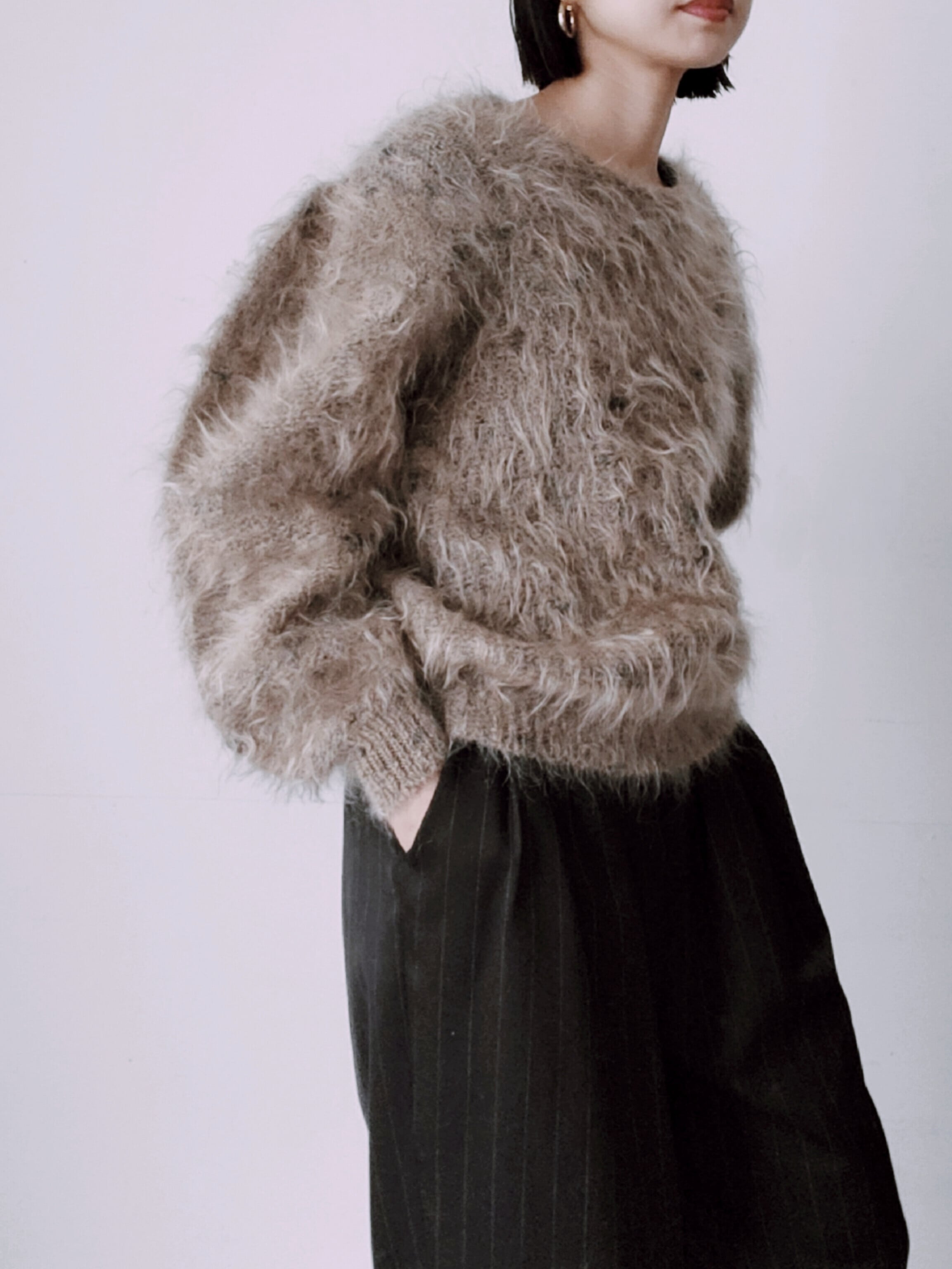 ベージュと黒のカラーが絶妙に組み合わさった、毛足の長いセーター。ふわふわとした温かみのあるデザインに、ボリューム袖が魅力を加え、軽やかで温かい一着です。